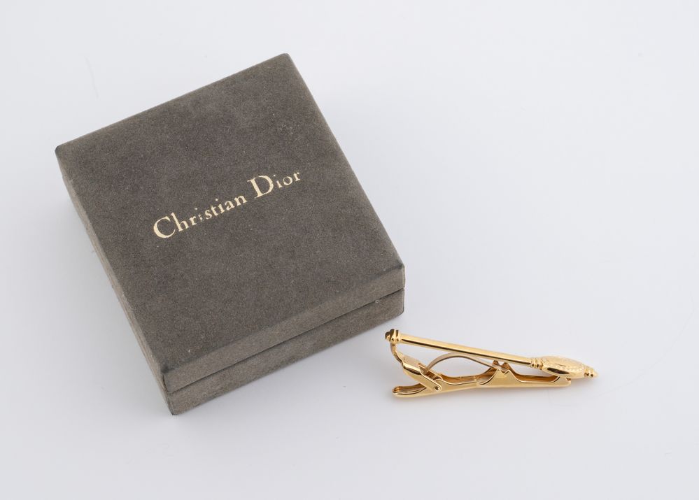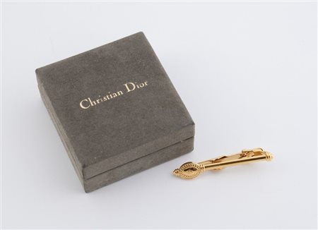 CHRISTIAN DIOR Fermacravatte in metallo dorato con logo CD. Cm 5,4. Al retro...