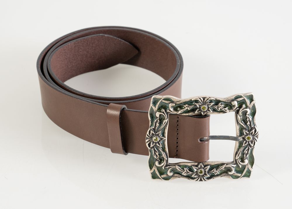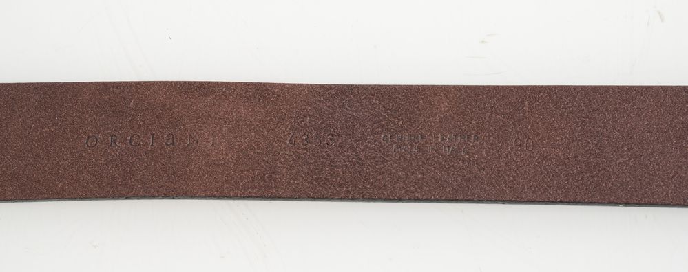 ORCIANI Cintura in pelle marrone con fibbia in metallo argentato con smalti e motivo floreale. Taglia 90. Lunghezza totale cm 108. Fascia spessore cm 3,9. Reca marchio Orciani, Genuine Leather e Made in Italy. Corredata da scatola.