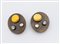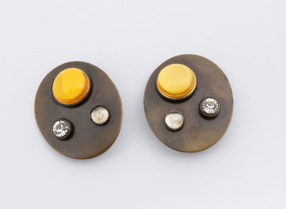 REGINA SCHRECKER Orecchini a clip in metallo bronzato con applicazioni di pietre sintetiche sui toni dell'arancio e del bianco. Cm 5x4. Al retro recano marchio Regina Schrecker Firenze Italy. (lievi difetti)
