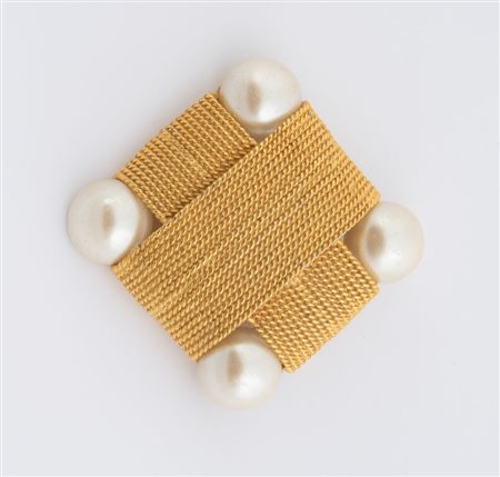 Spilla in metallo dorato a forma romboidale rifinita in ogni angolo da perle. Cm 7,5x7,3.