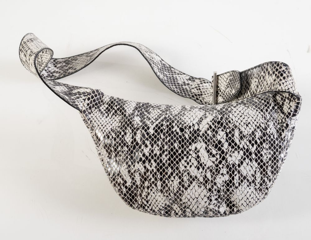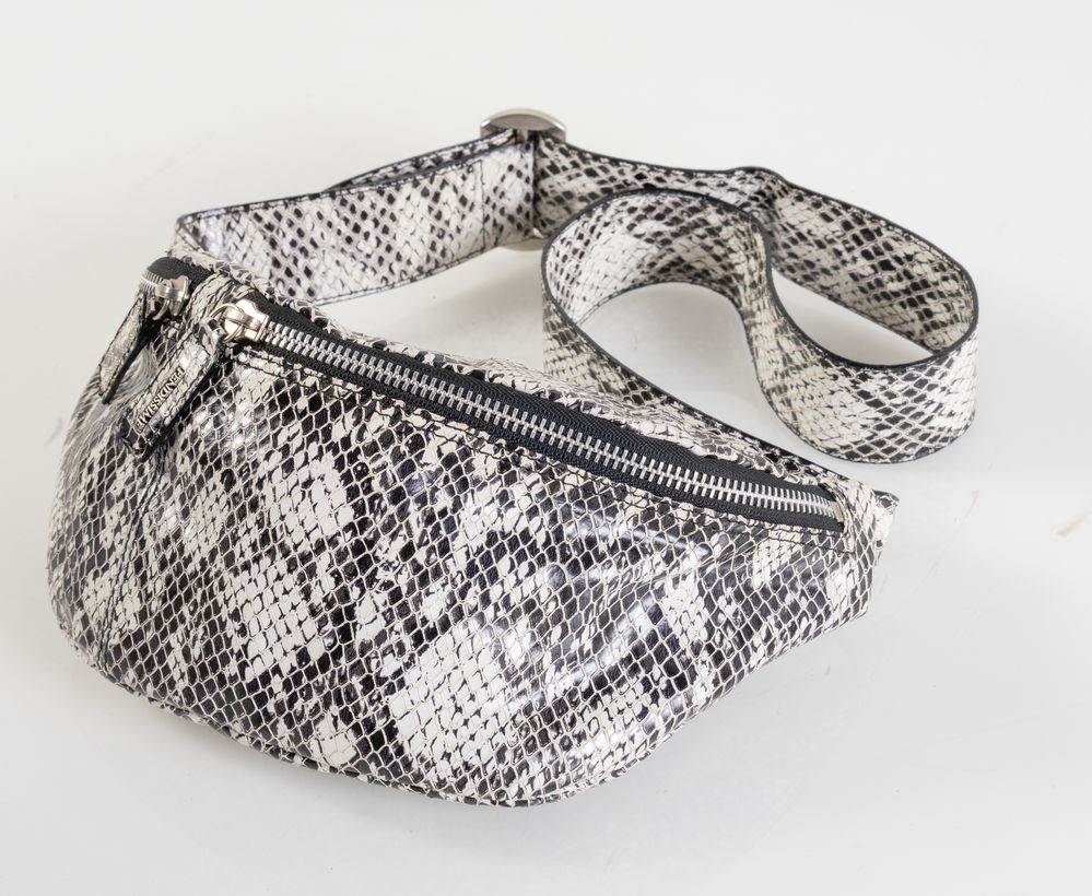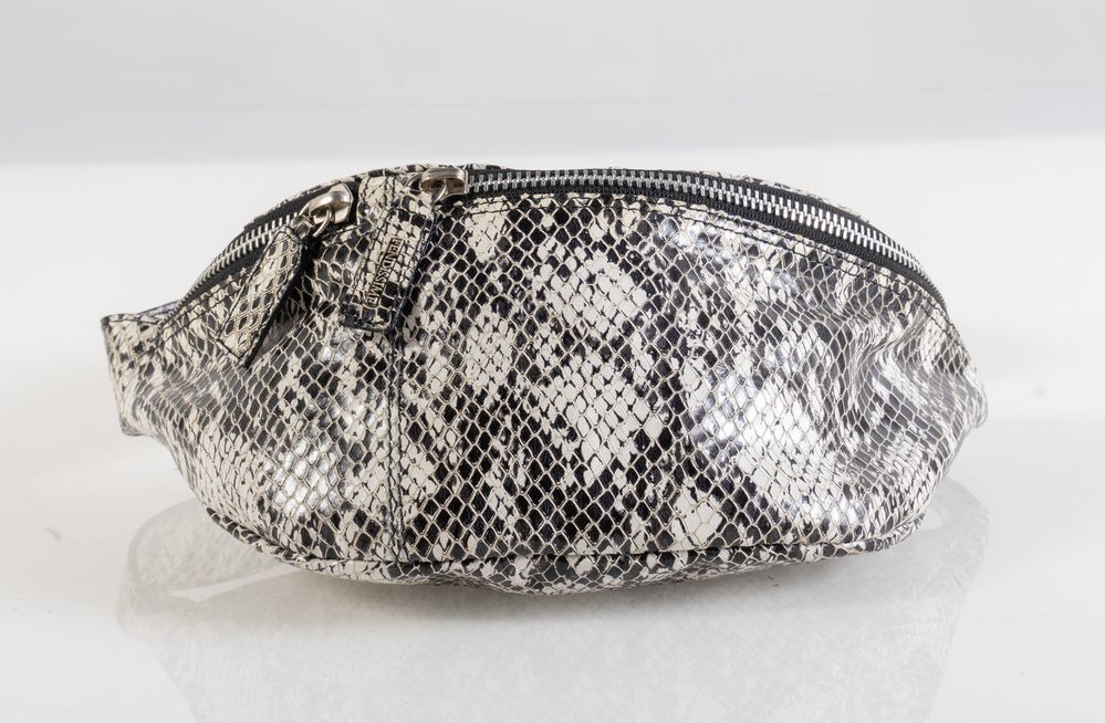 FENDISSIME Marsupio a due tasche in similpelle a stampa pitone sui toni del bianco e del nero. Cm 14x25x11; tracolla cm 75. Dettagli in metallo argentato. Reca marchio ed etichetta Fendissime Accessori.