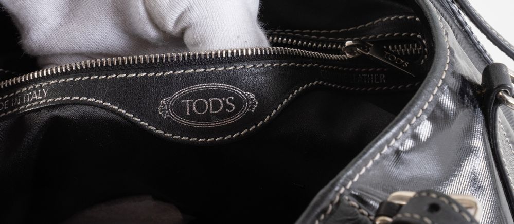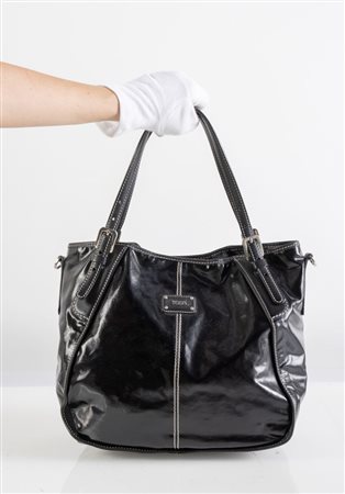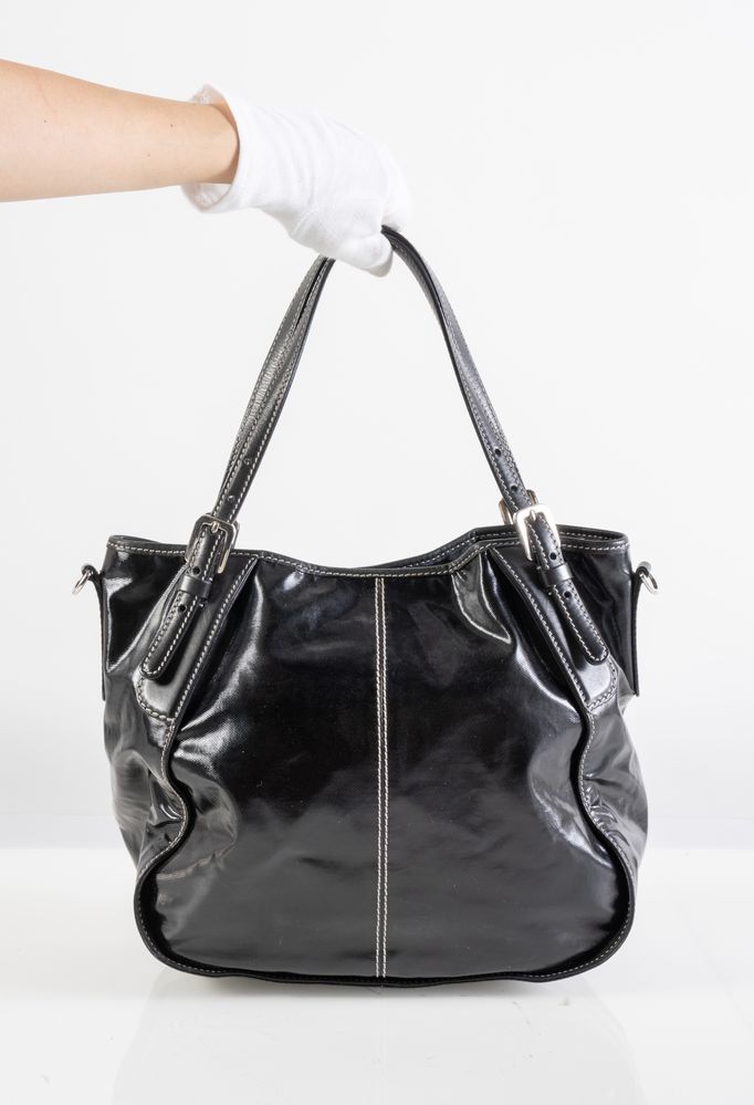 TOD'S Borsa in vinile nero con cuciture bianche e finiture in metallo argentato e pelle. Cm 25x38x14. Altezza con manici cm 45. Tracolla removibile. All'interno reca tre tasche. Reca marchi Tod's, Made in Italy e Genuine Leather.