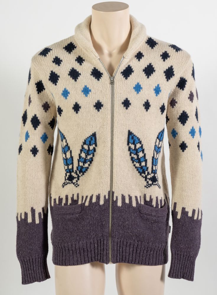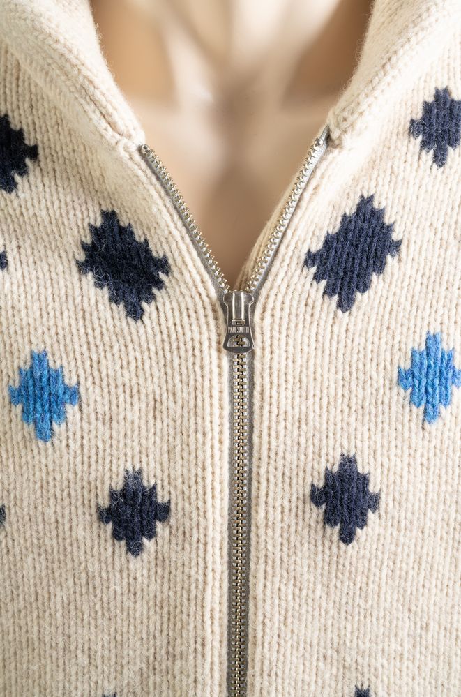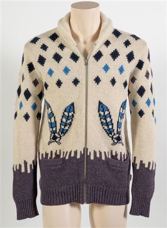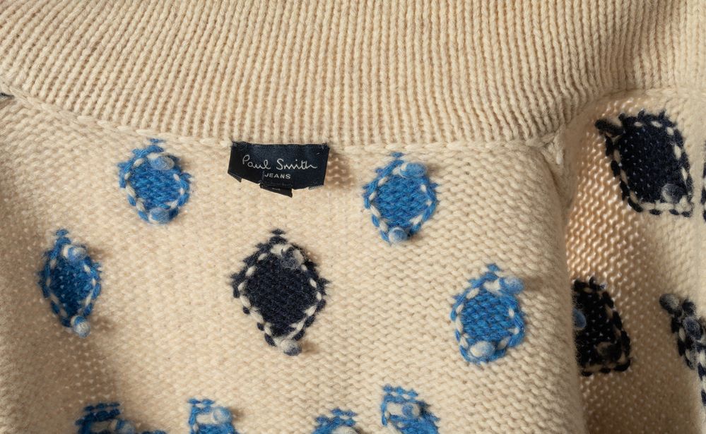 PAUL SMITH Cardigan da uomo in lana a fantasia sui toni dell'avorio, blu, azzurro e viola. Taglia M. Composizione 100% lana. Reca etichetta e marchio Paul Smith Jeans.