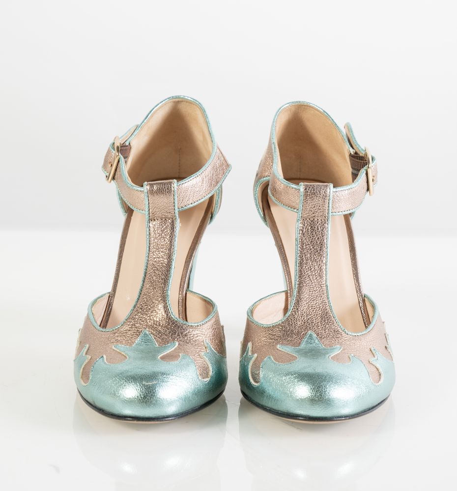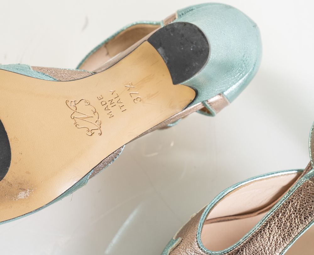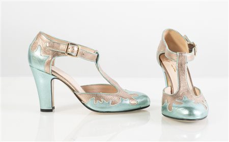 LENORA Scarpe modello Dolly in pelle laminata bicolore azzurro e cipria. Taglia 37.5. Tacco cm 8,5. Reca marchio Lenora, Made in Italy. Corredate da scatole e dustbag. (lievissimi difetti)