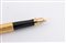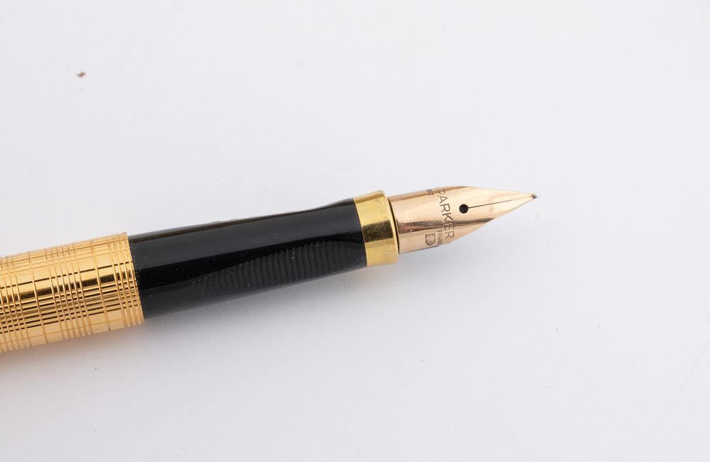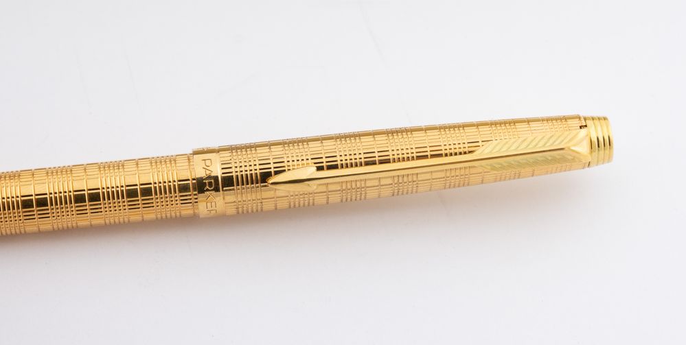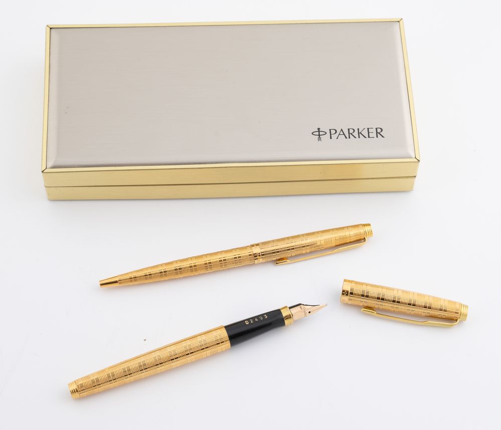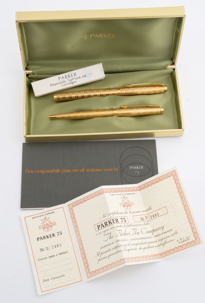 PARKER Cofanetto composto da una penna stilografica e da una penna a scatto in metallo dorato lavorato a righe. La stilografica è una Parker 75 D/2493 con pennino in oro 14kt. Cadauna di cm 13. Recano certificato di origine. Corredata da scatola.