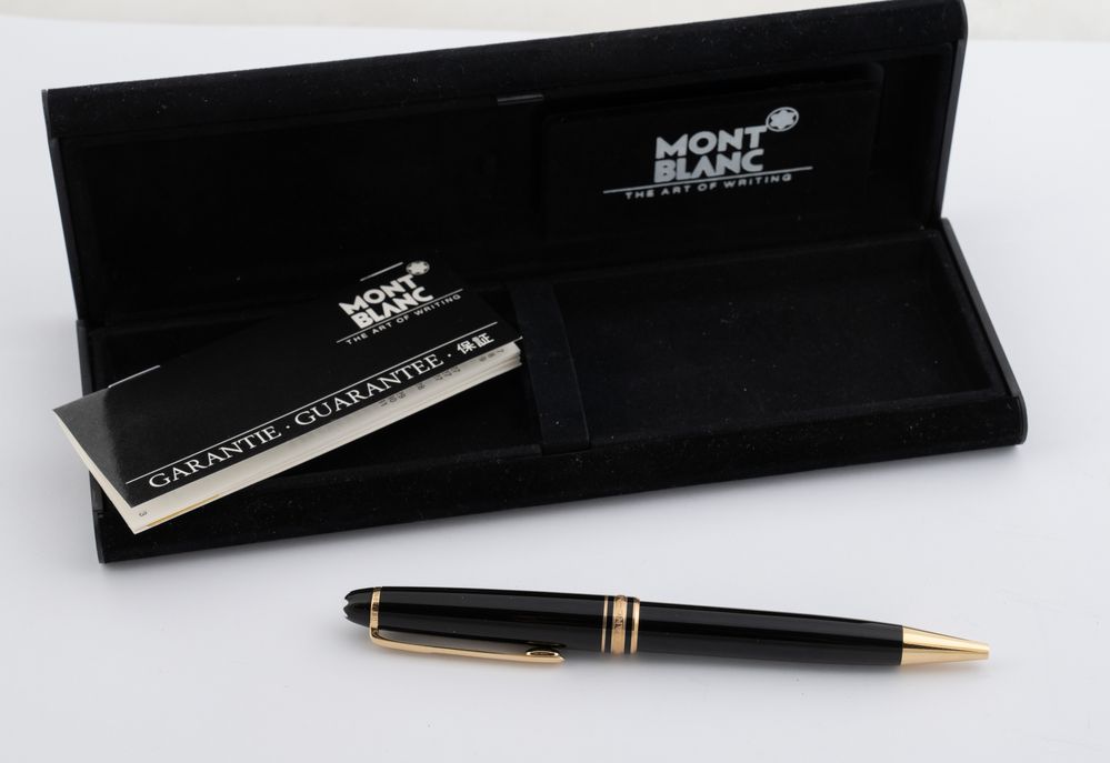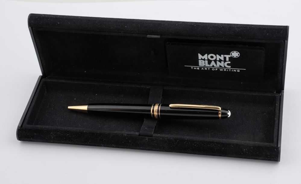 MONTBLANC Penna a sfera modello Meisterstuck Nero 164. Corpo in resina nera, dettagli di rifinitura dorata, cappuccio sormontato dal marchio a stella bianca. Meccanismo a rotazione. Corredata da scatola e garanzia. Lunghezza: cm 13,5. (lievissimi difetti)