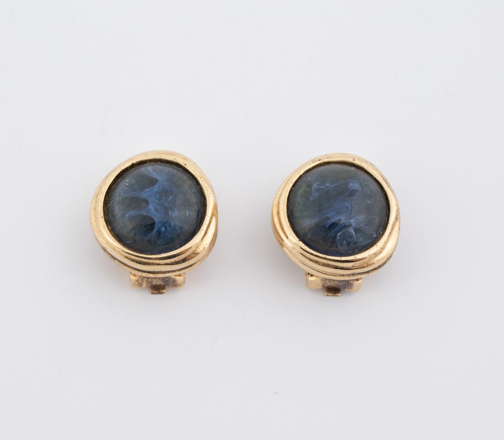 CHRISTIAN DIOR Orecchini a clip in metallo dorato con pietra cabochon cui toni del blu. Cadauno di cm 2x2. Al retro recano marchio Chr.Dior, Germany.
