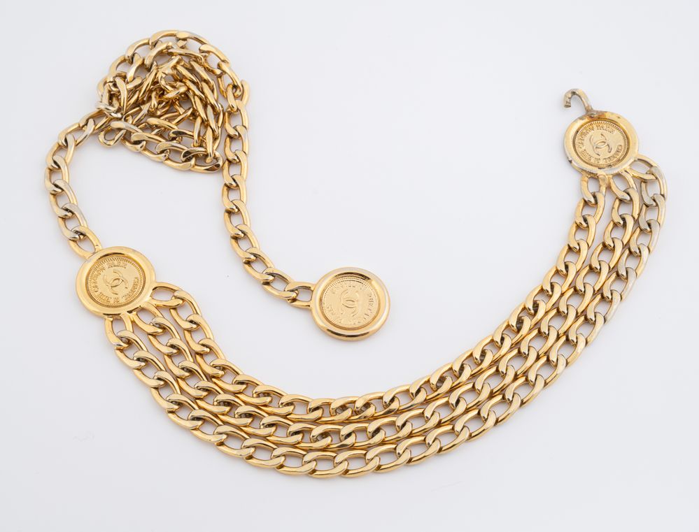 CHANEL attr. Cintura a catena in metallo dorato. Lunghezza totale 107. Reca...