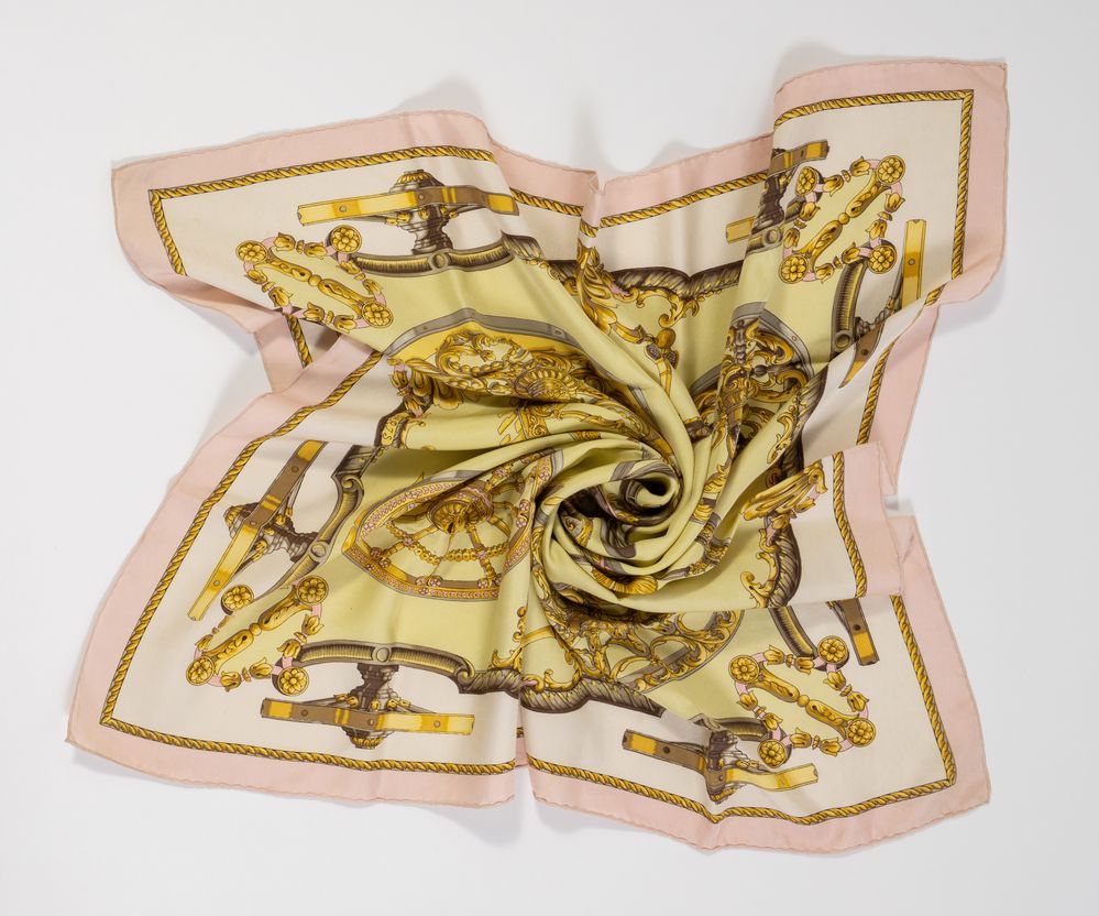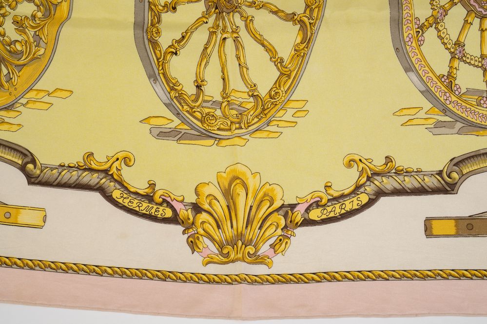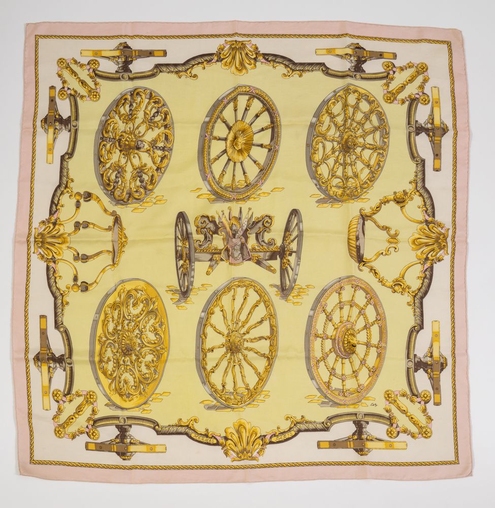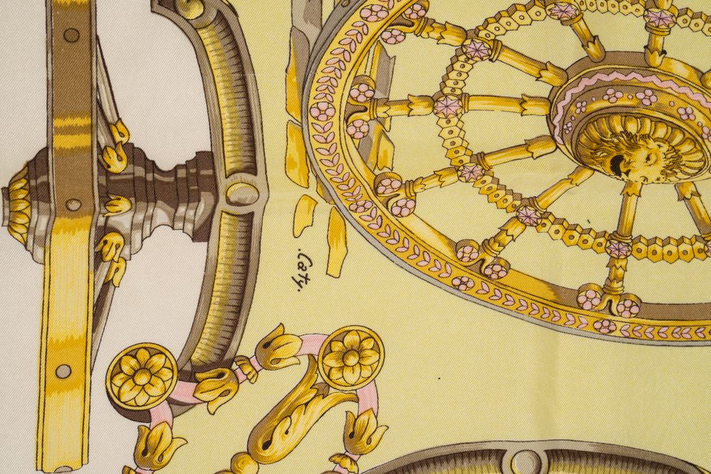 HERMÈS "Les Roues". Foulard in seta a fantasia sui toni del verde, del rosa e del giallo. Disegnato da Caty Latham nel 1967. Cm 92x87. Reca marchio Hermès Paris e firma Caty. (difetti)