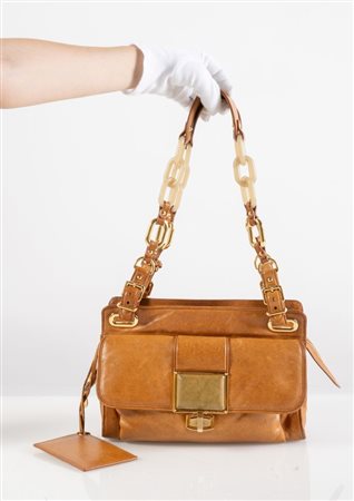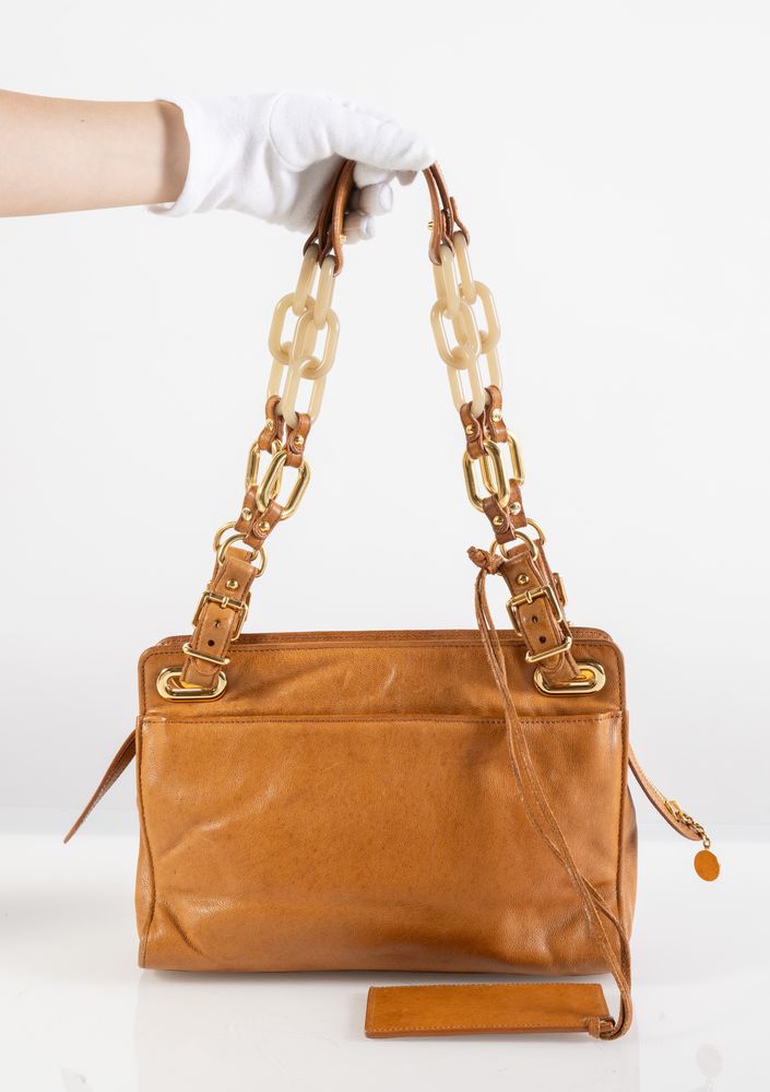 BALENCIAGA Borsa in pelle color cuoio con finiture in metallo dorato e manici a catena in resina e metallo dorato. Cm 20x28x10; altezza con manici cm 47. Reca uno specchietto. Sul fronte e sul retro reca tasche. All'interno reca una tasca con cerniera. Reca marchio Balenciaga ed etichetta Balenciaga Paris, Made in Italy e codice di riferimento prodotto. (lievissimi difetti)