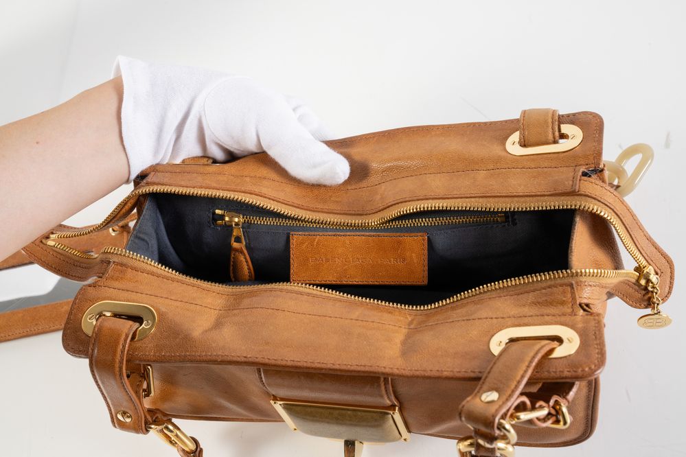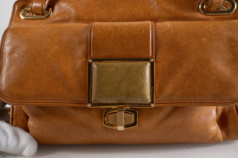 BALENCIAGA Borsa in pelle color cuoio con finiture in metallo dorato e manici...