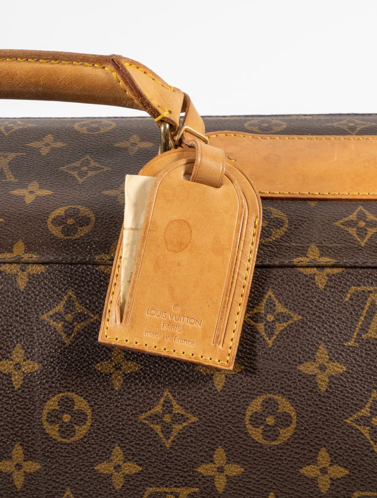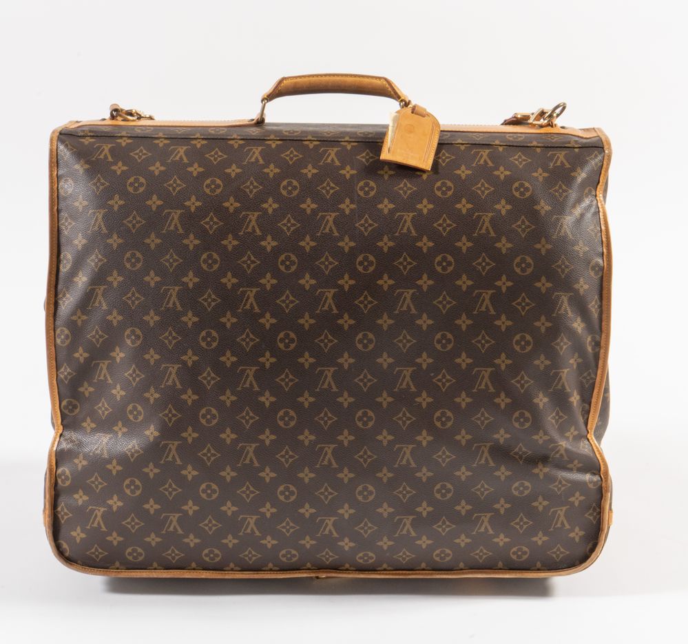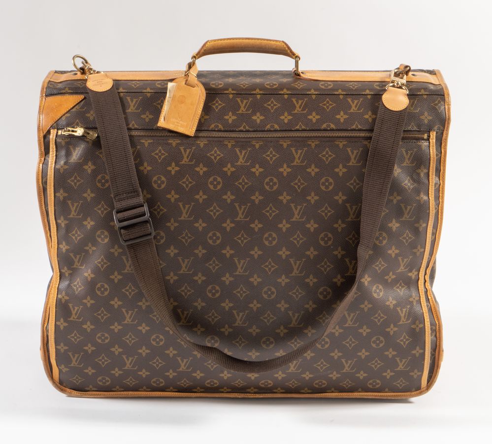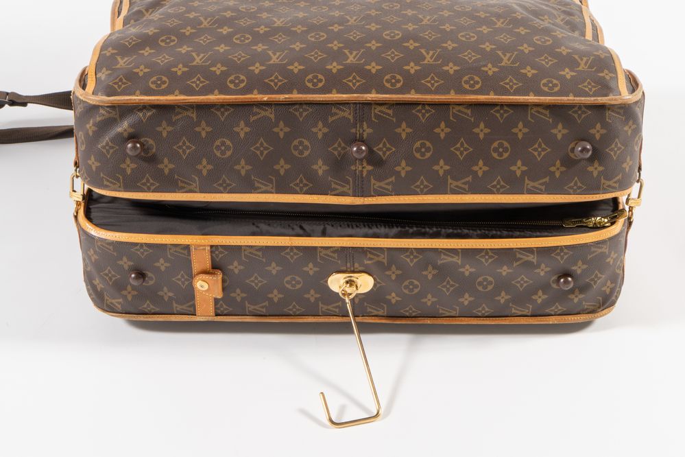 LOUIS VUITTON Porta abiti pieghevole in tela monogram con rifiniture in cuoio e dettagli in metallo dorato. Reca manico e tracolla regolabile. Dimensioni chiuso: cm 58x60x25. Dimensioni aperto: cm 101x60x11. Interno rifinito in tessuto marrone. Riporta machi LV, Louis Vuitton, Louis Vuitton Paris Made in France e codice di riferimento prodotto. (Difetti)