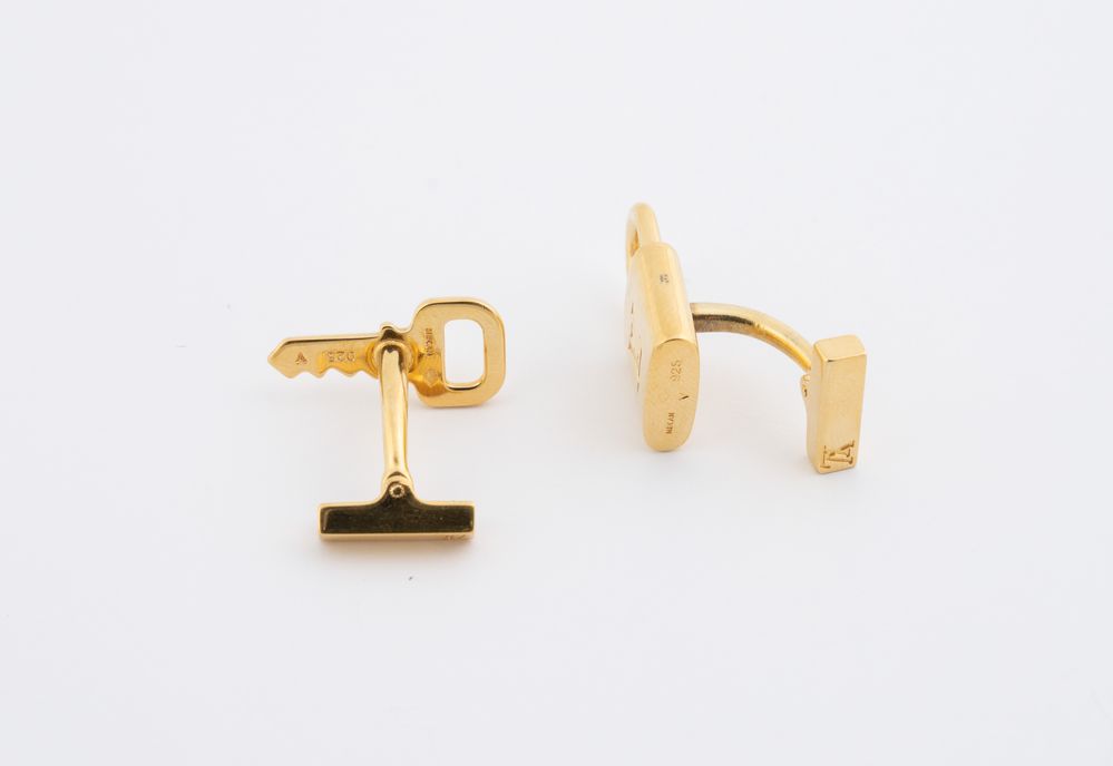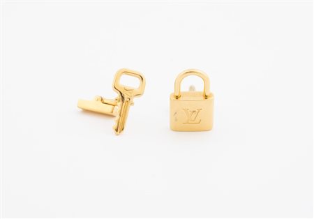 LOUIS VUITTON Gemelli in argento 925 placcato oro con chiave e lucchetto. Cadauno di mm 25x20. Ciascuno reca marchio LV e punzone 925. (lievi difetti)