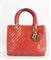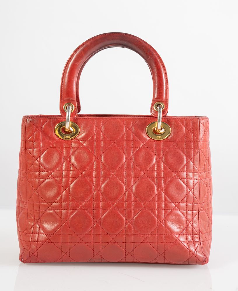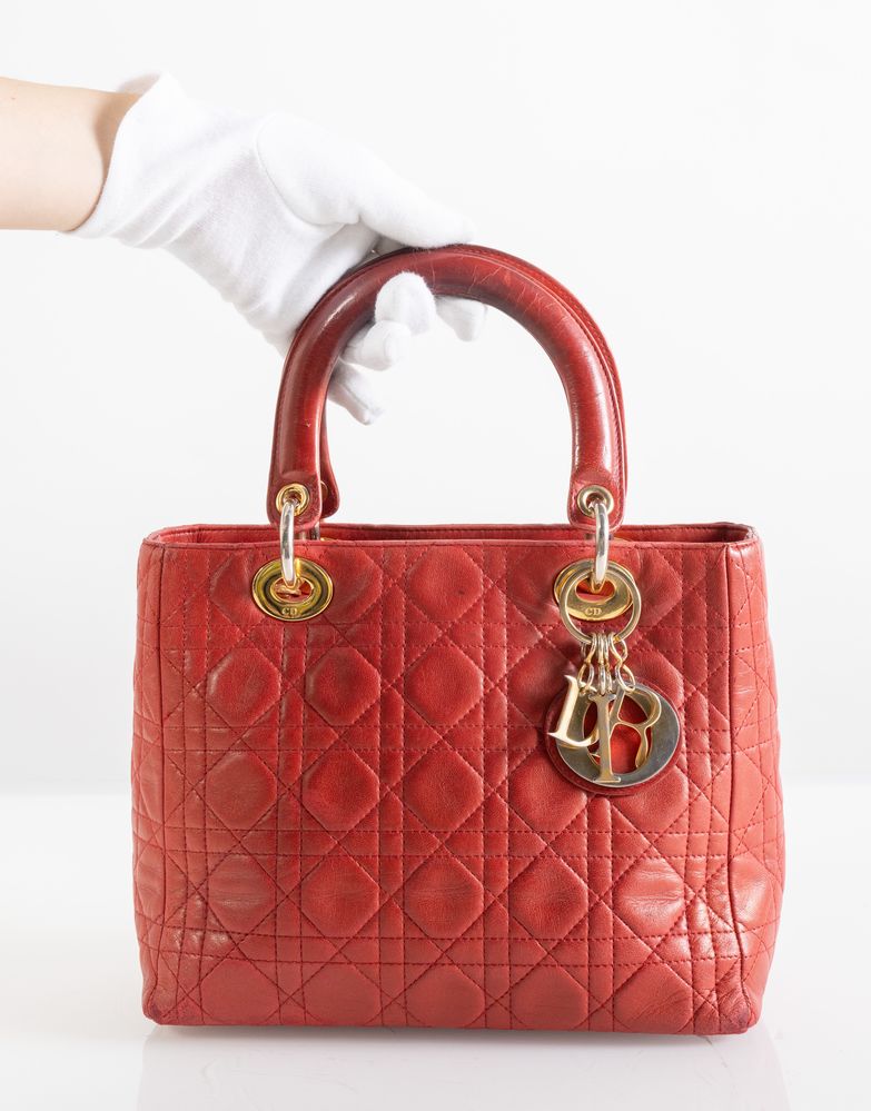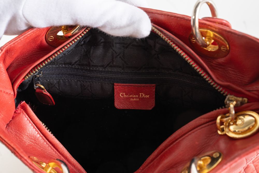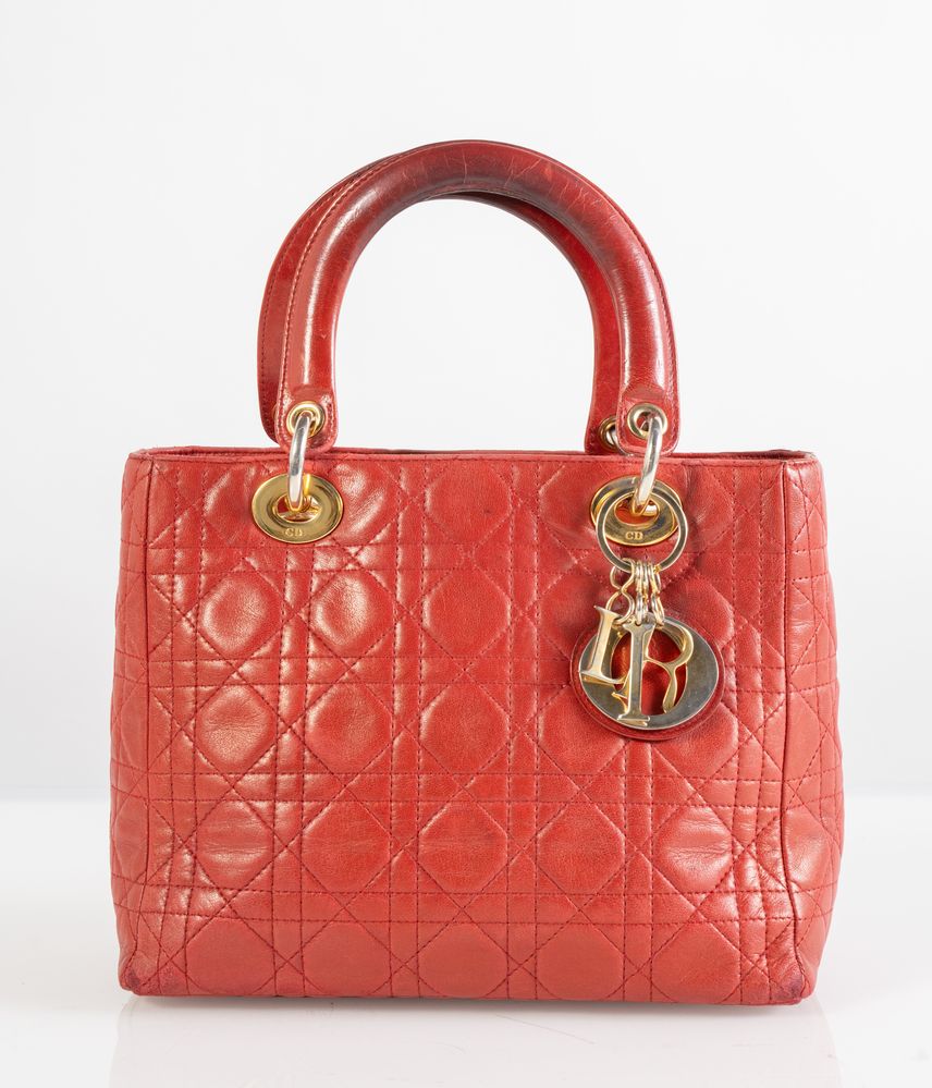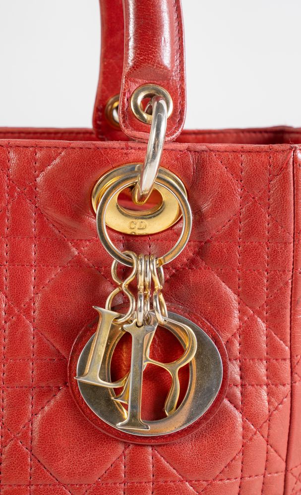 CHRISTIAN DIOR Borsa modello Lady Dior in pelle d'agnello rossa con impuntura Cannage e ciondoli D.I.O.R. Cm 20x23x11; altezza con manici cm 32. Dettagli in metallo dorato. All'interno reca tascha con cerniera. Reca marchi CD, Dior, Christian Dior Paris, Made in Italy. (difetti)