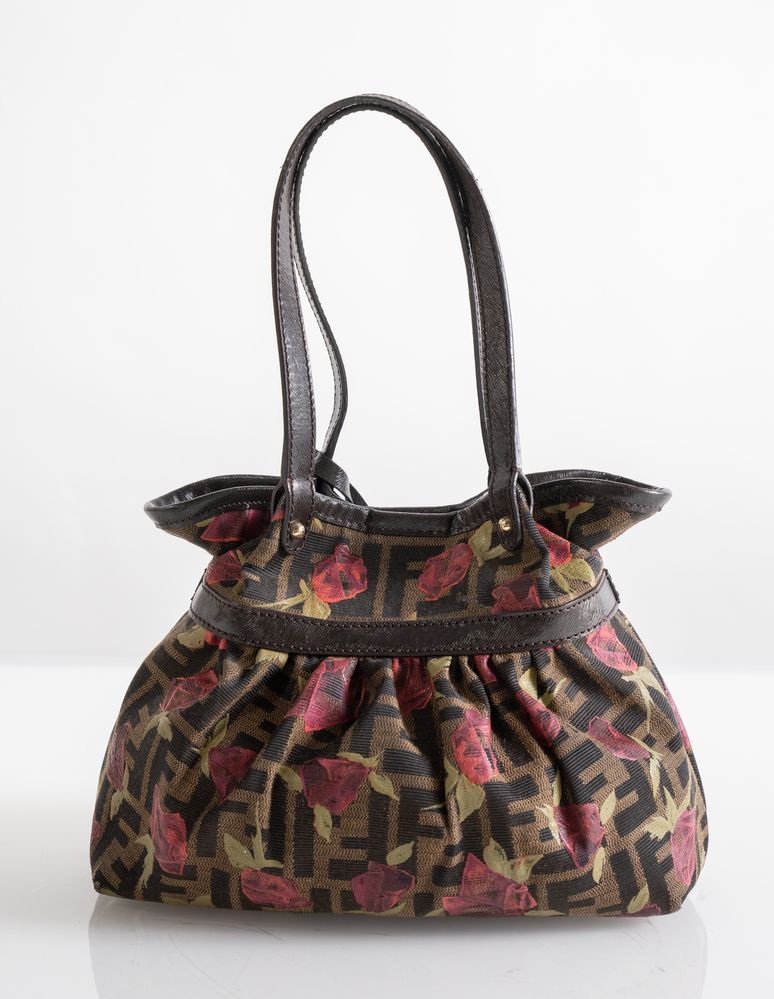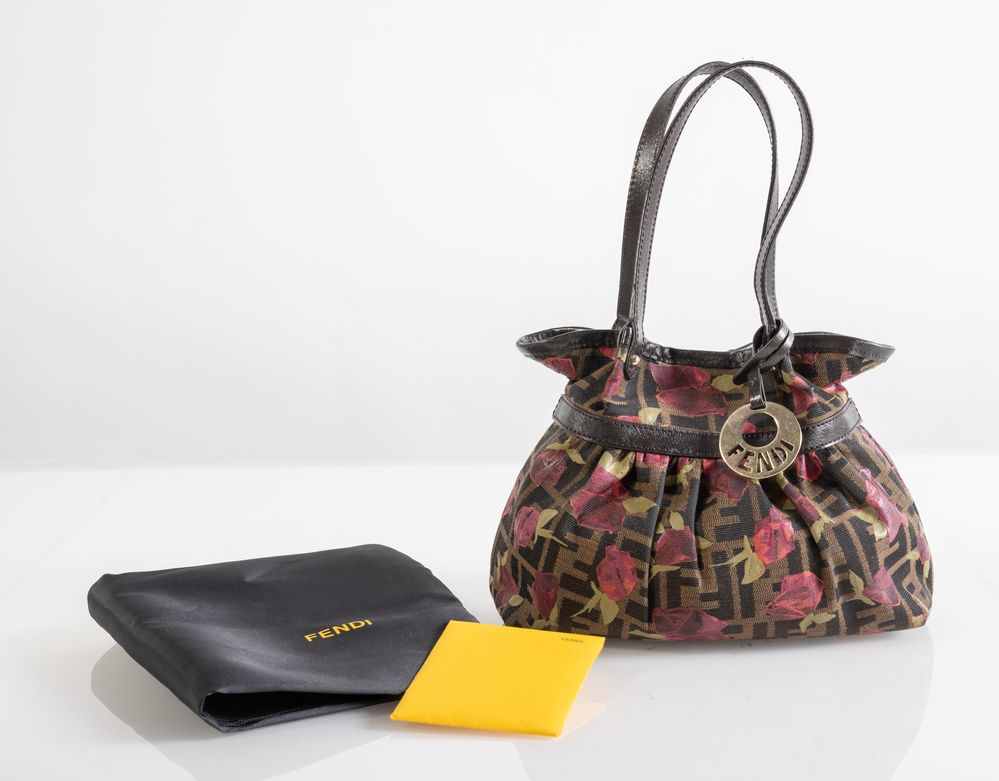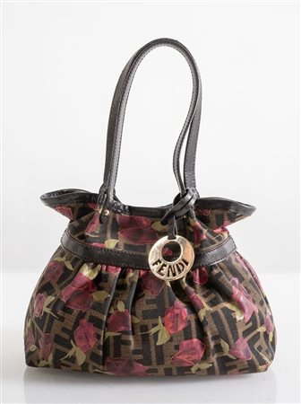 FENDI Borsa modello Shopping Mare Mini in tela Zucca monogram con disegno rose rosse e dettagli in pelle marrone. Edizione limitata 2010. Cm 17x23x15; altezza con manici cm 31,5. Dettagli in metallo dorato. Reca marchi Fendi Made in Italy e codice di riferimento prodotto. Corredato da certificato di autenticità e dustbag.