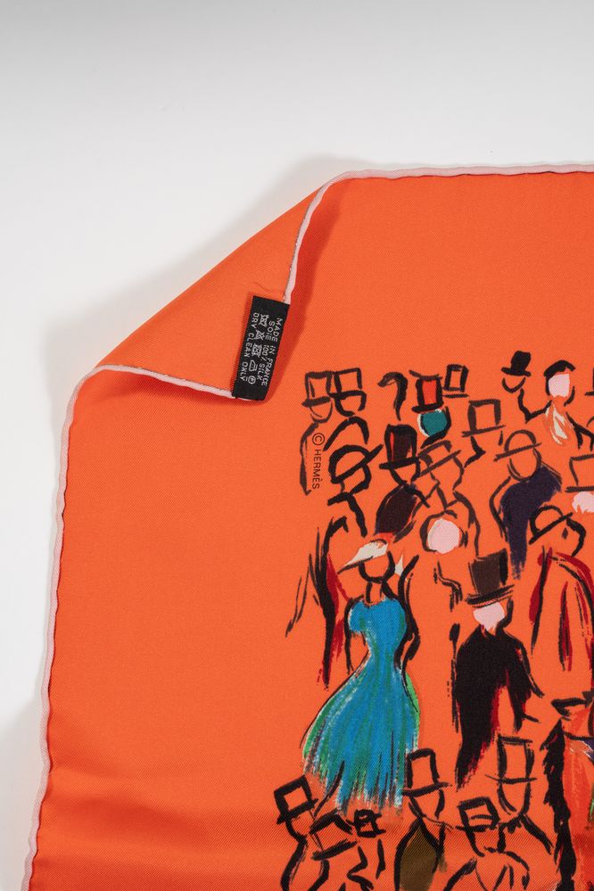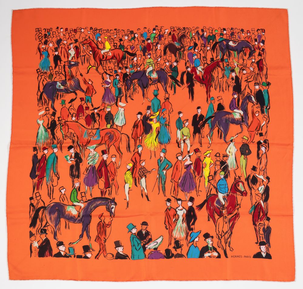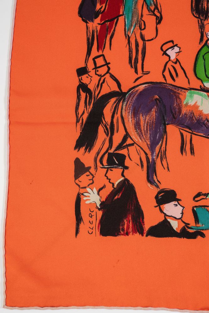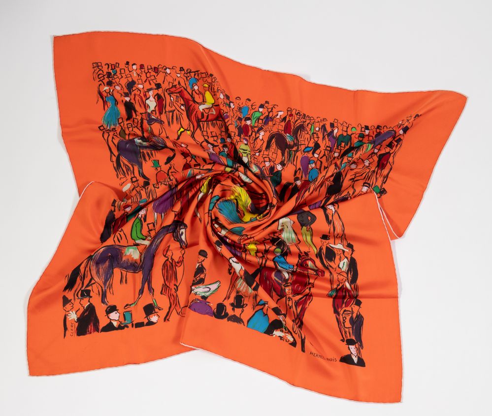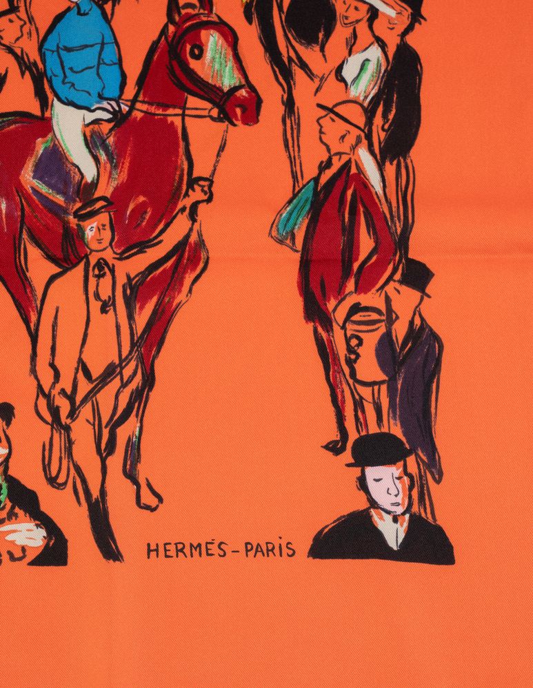 HERMÈS "Paddock". Foulard in seta fantasia. Collezione 2015. Firmato da Jean-Louis Clerc. Realizzato per la prima volta nel 1956, poi ristampato nel 2004 e nel 2015. Cm 90x90. Composizione 100% seta. Reca marchio Hermès ed etichetta Made in France. (lievissimi difetti)