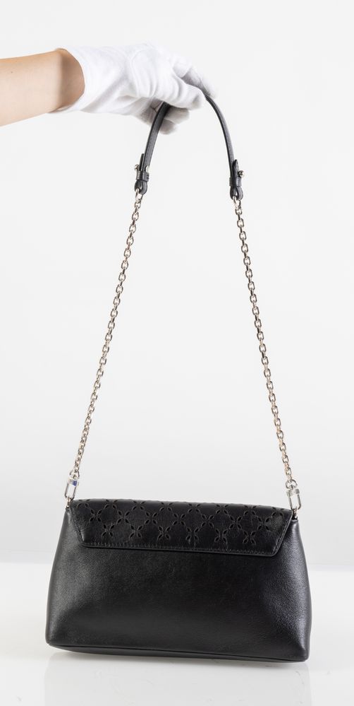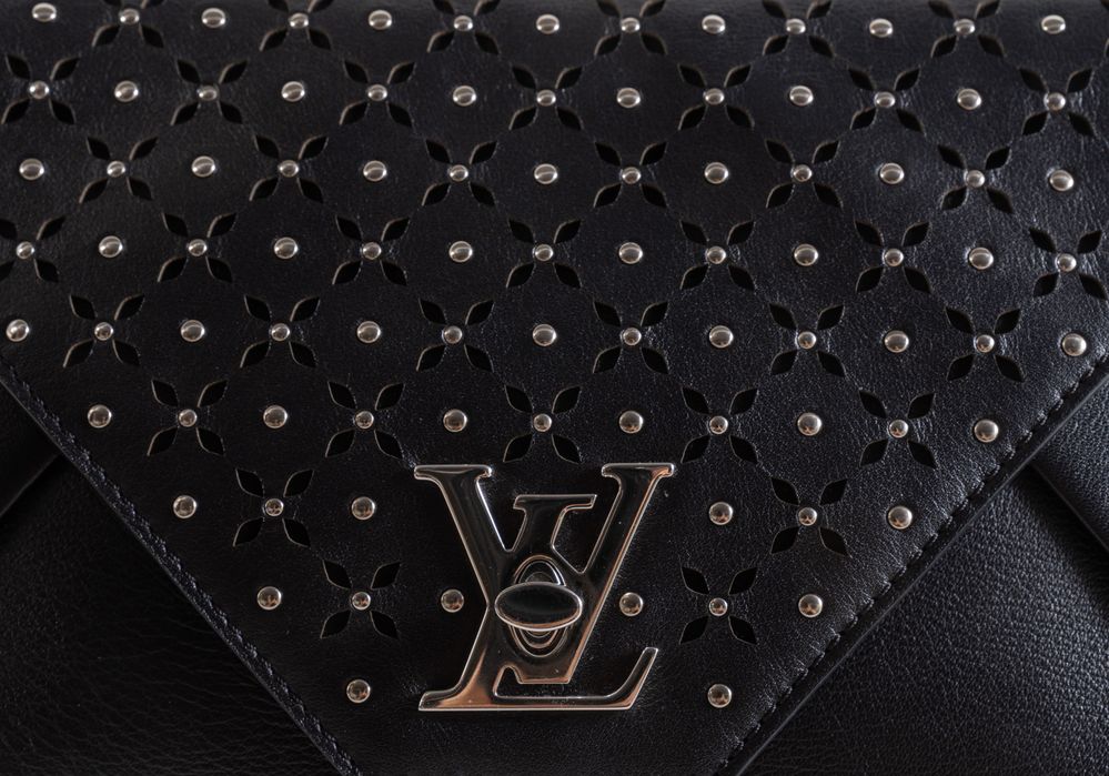 LOUIS VUITTON Borsa a tracolla modello Love Note in pelle di vacchetta nera con patta traforata a motivo floreale con borchie e logo LV in metallo argentato. Cm 14x26x5; tracolla cm 93. Reca marchi LV, Louis Vuitton Paris Made in France e codice di riferimento prodotto. Corredata da dustbag.