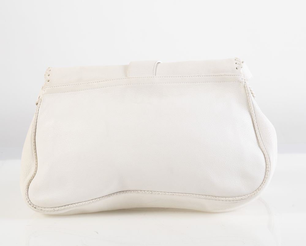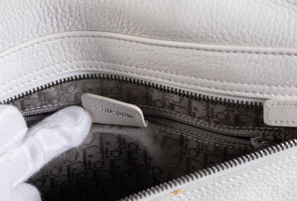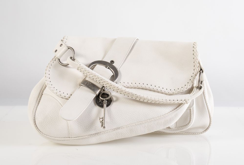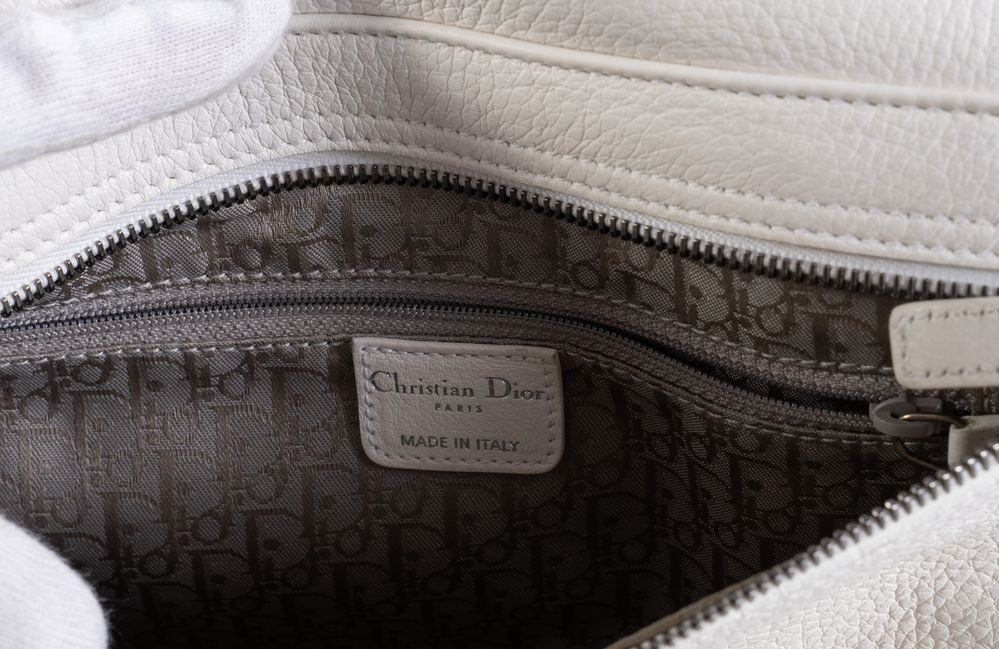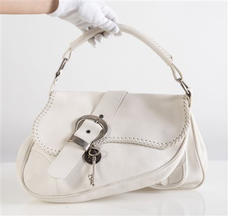 CHRISTIAN DIOR Borsa modello Gaucho Double Saddle in pelle martellata bianca. Anni '90. Cm 25x35x17; manico cm 46. Dettagli in metallo argentato. Reca due capienti scomparti, una tasca esterna e una interna. Reca marchi Dior, Christian Dior 1947 ed etichetta Christian Dior Paris, Made in Italy e codice di riferimento prodotto. (lievi difetti)