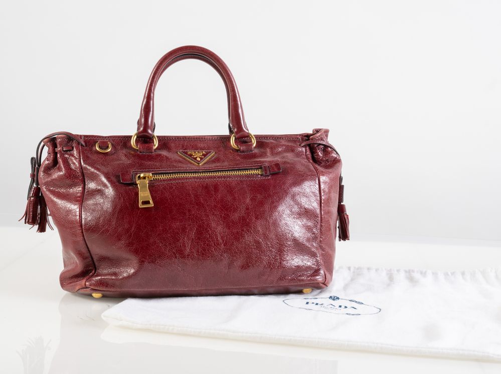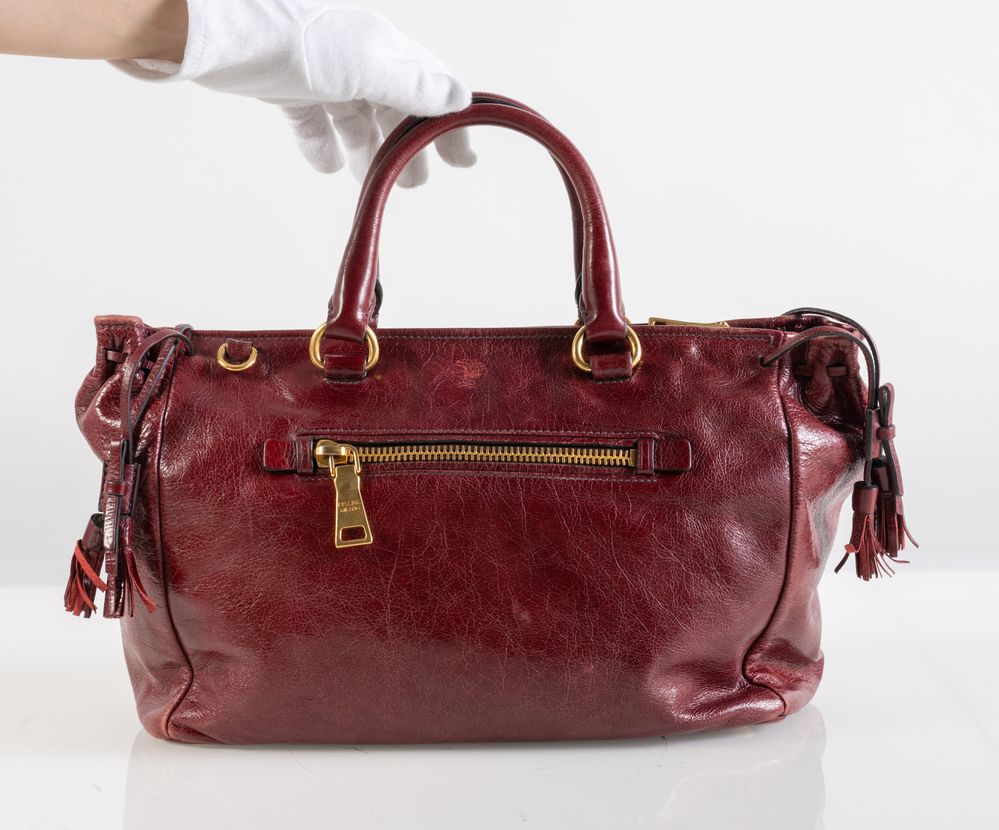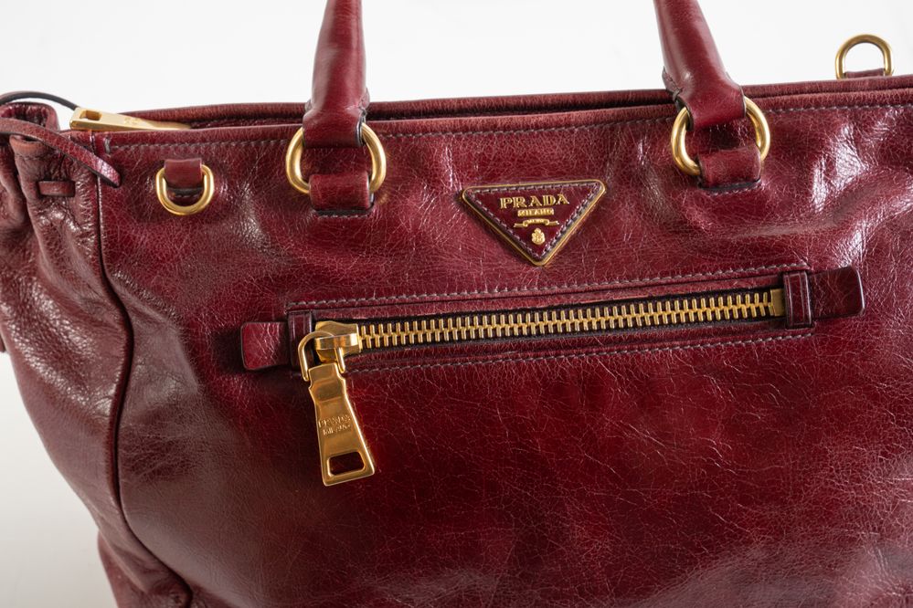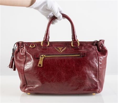 PRADA Borsa in pelle lucida bordeaux. Cm 21,5x33x15; manici cm 30. Dettagli in metallo dorato. Reca tracolla regolabile e removibile e tre tasche con chiusura a zip, una sul fronte, una al retro e una internamente. Reca marchio Prada, Milano dal 1913 ed etichette Prada Milano e Made in Italy e codice di riferimento prodotto. Corredata da dustbag. (lievi difetti)