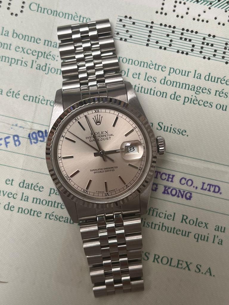Rolex datejust 16234 Diametro 36mm Vetro zaffiro Cinturino jubilee Quadrante argento Orologio con garanzia Rolex Anno 1991