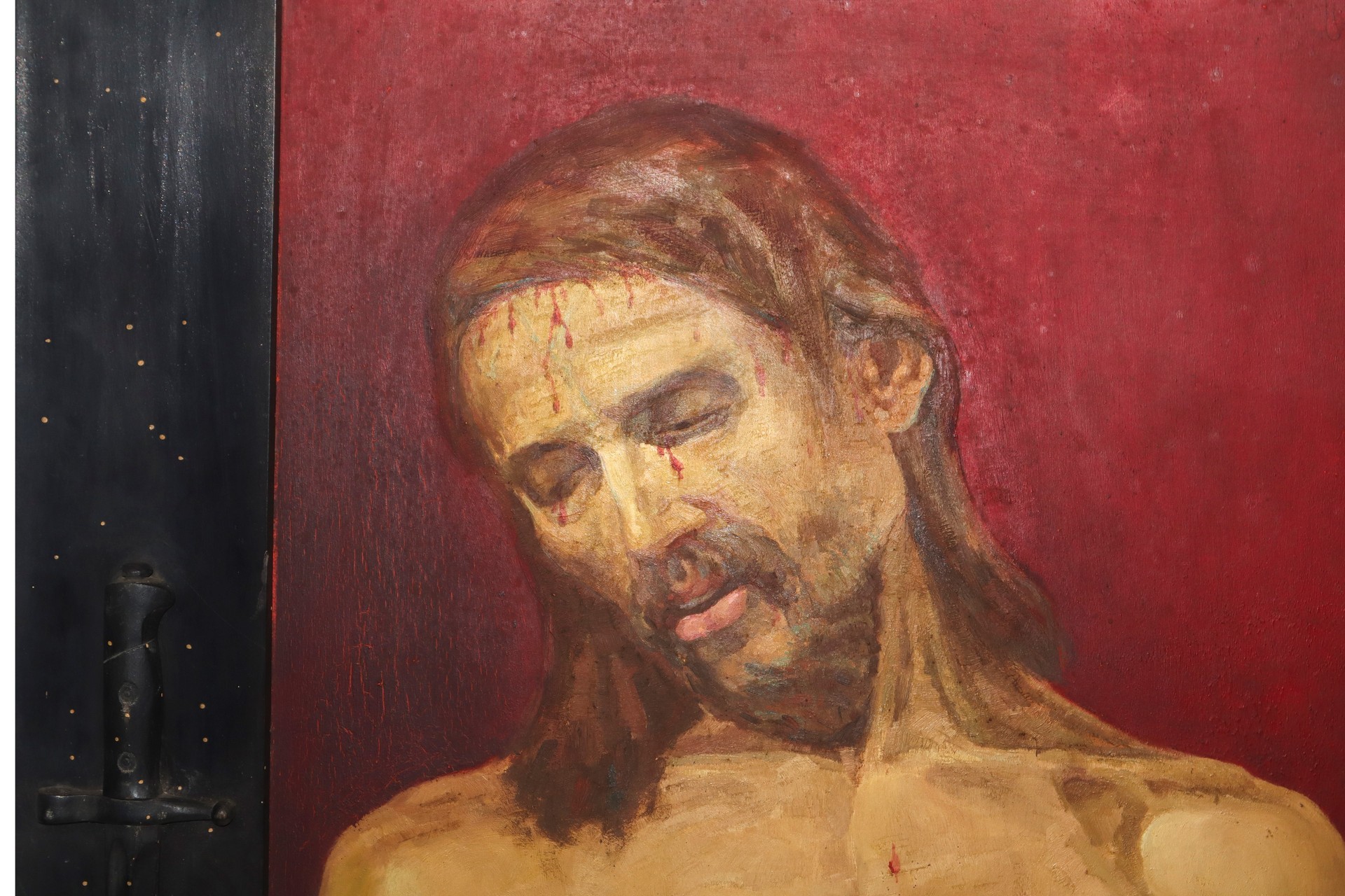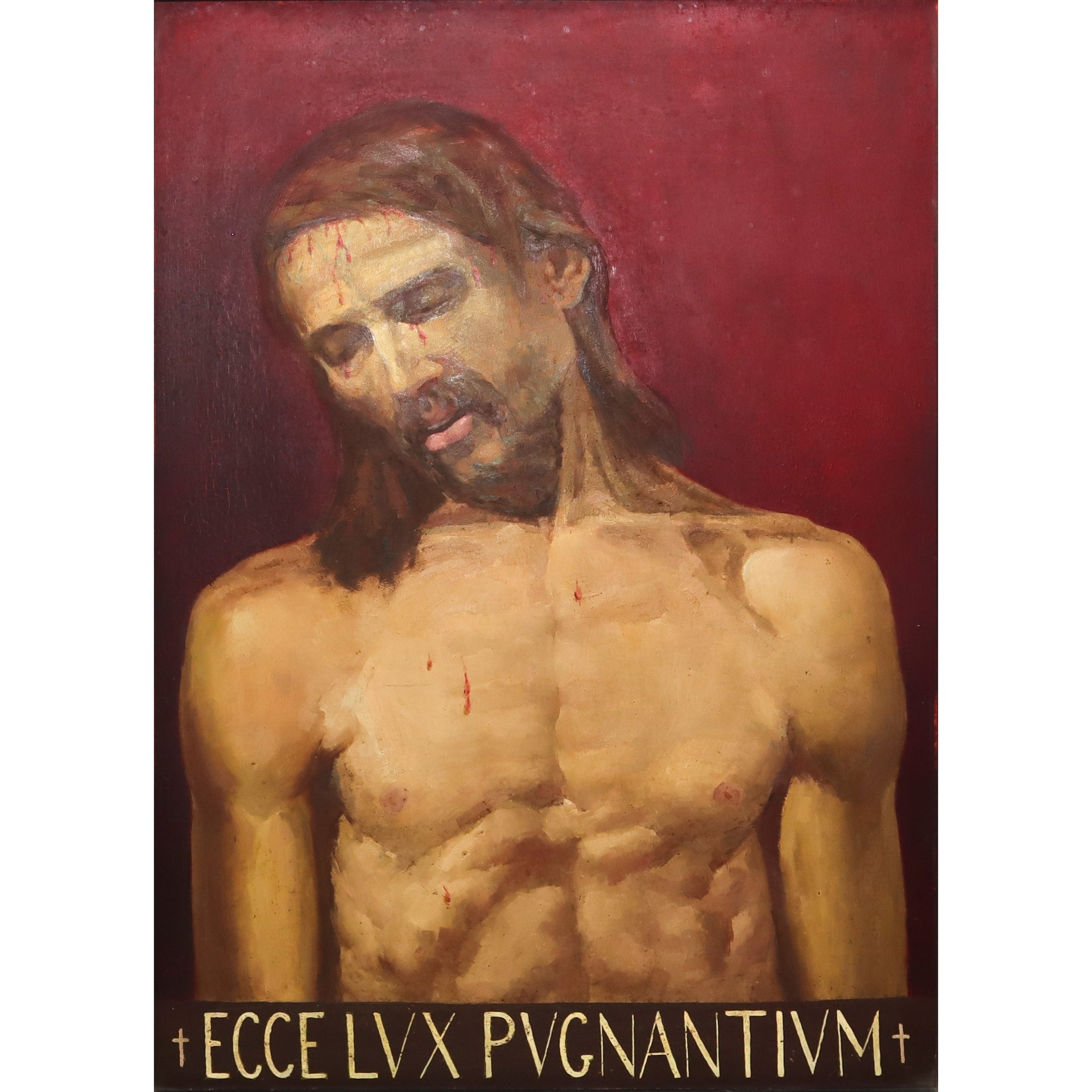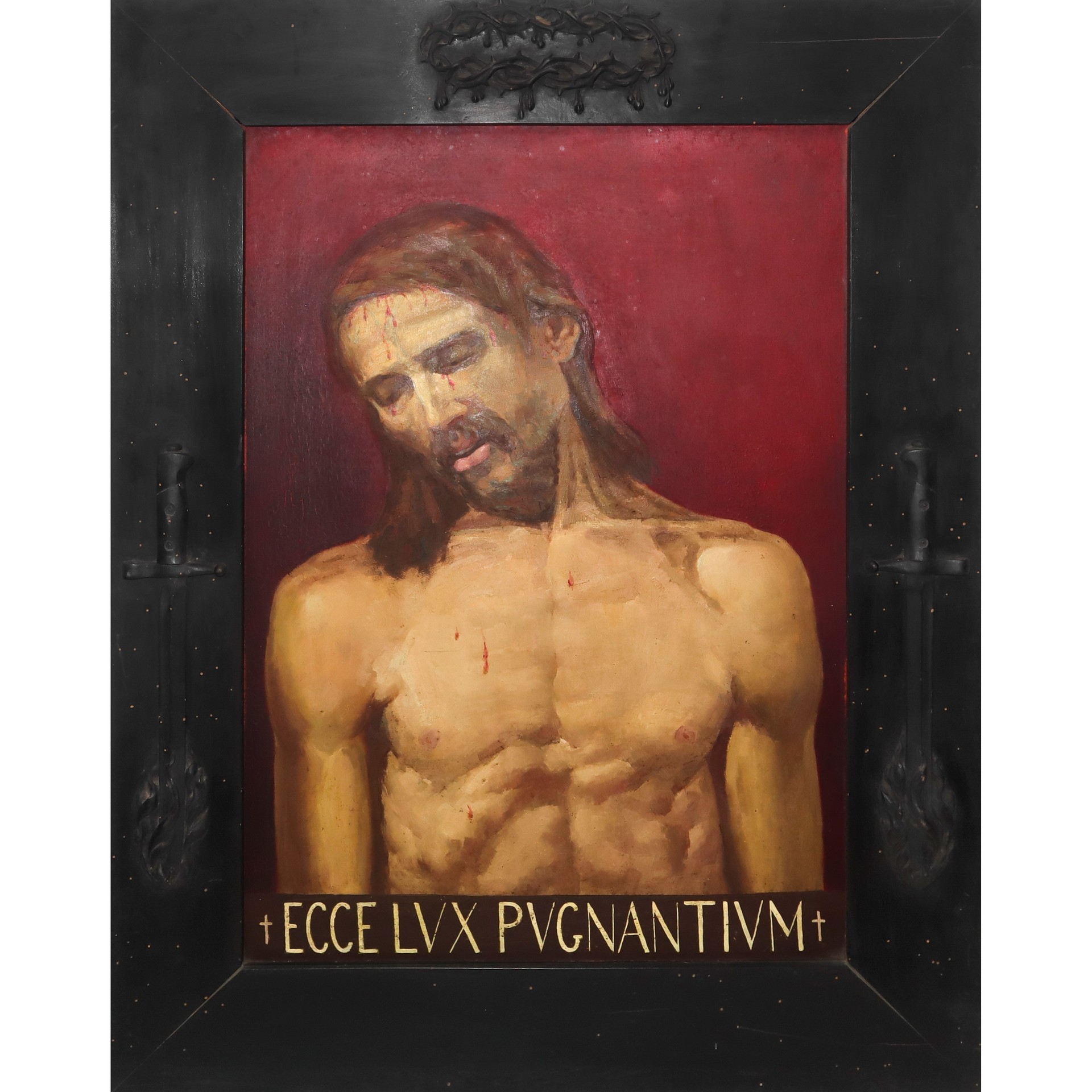 Raffigurante Ecce Homo H cm 82 x 58 / in cornice 107 x 83 Olio su metallo cornice di legno nero intagliato con motivi del periodo Mussoliniano, attribuibile a Francesco Patanè (1902,1980) scritta in basso ECCE LVX PVGNANTIVM