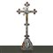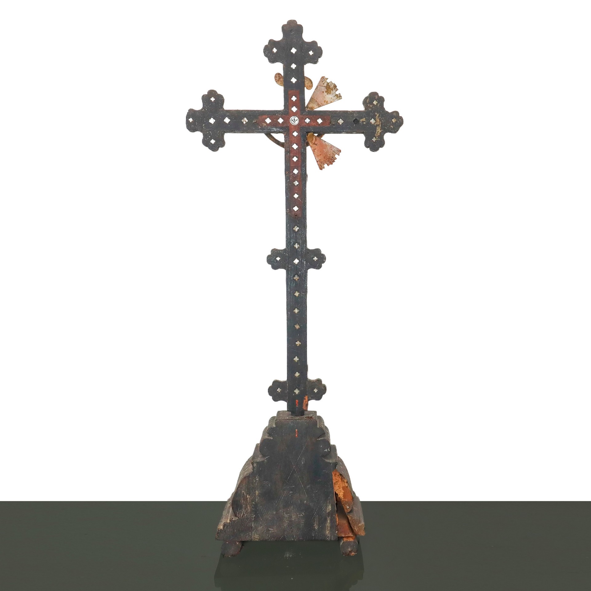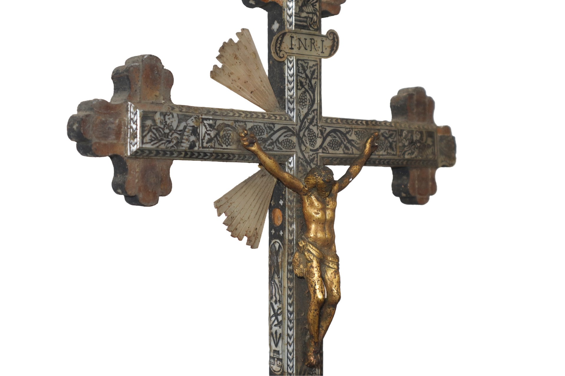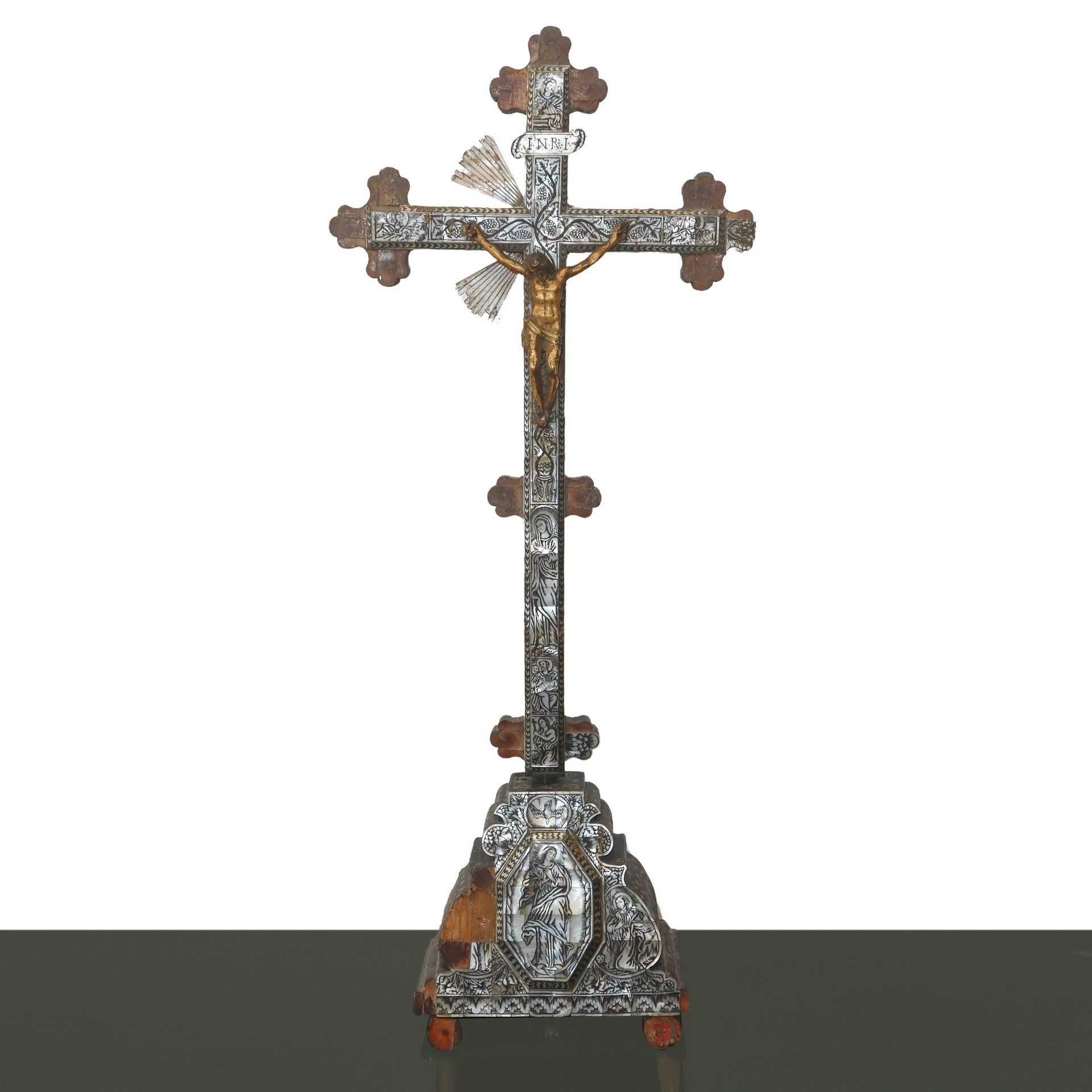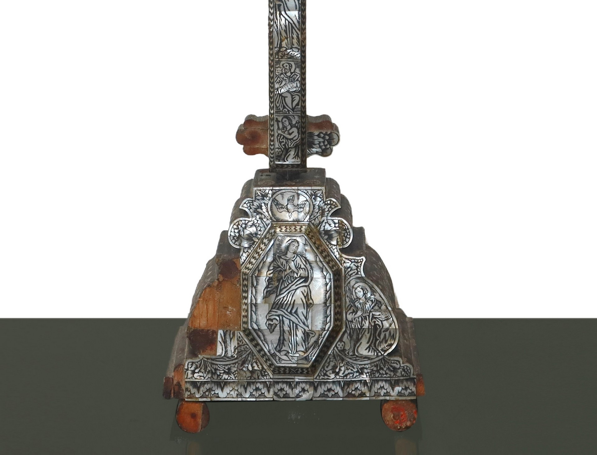 Crocifisso legno con piedistallo, lastronato in madreperla decorata a bulino con figure sacre, XVIII Secolo H cm 63 Presenti mancanzePresenti mancanze