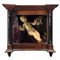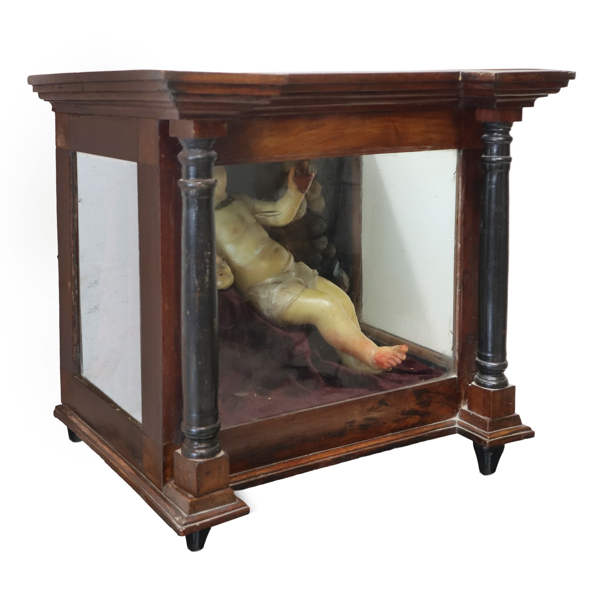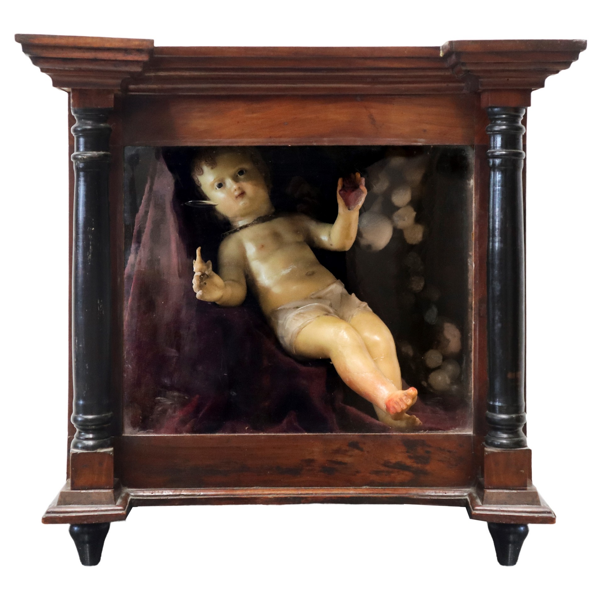 Bambinello stante in cera con colomba e cuore sacro, uva, fico d'india e pera in teca Bambinello cm 33x33 x18, teca Cm 45X47x38 Metà XIX secolo Teca in legno di noce