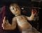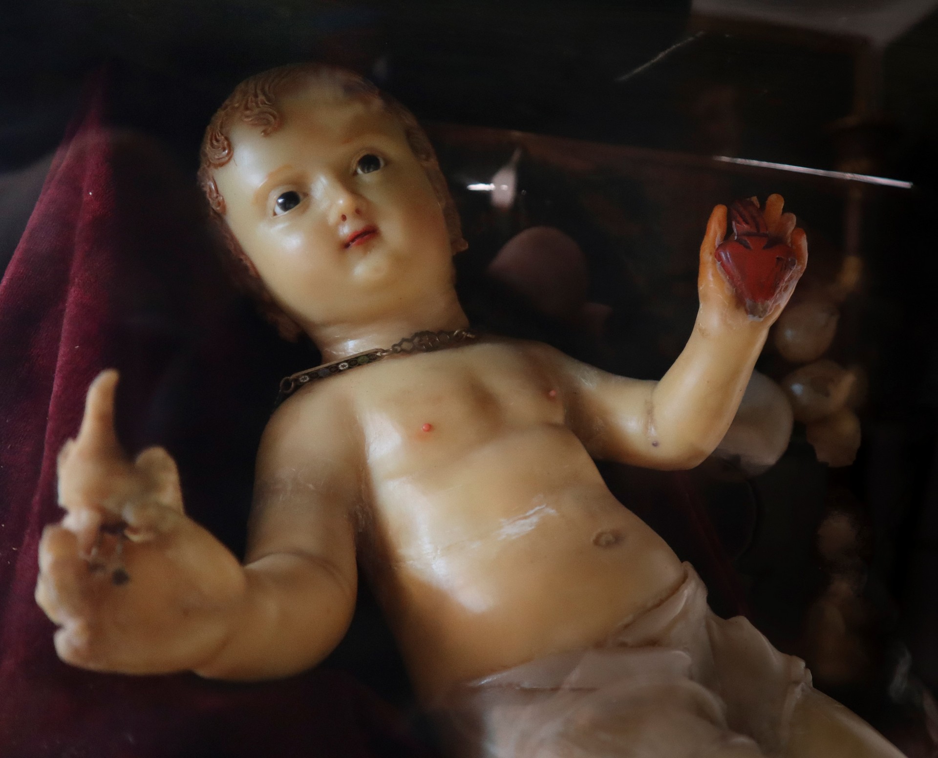 Bambinello stante in cera con colomba e cuore sacro, uva, fico d'india e pera in teca