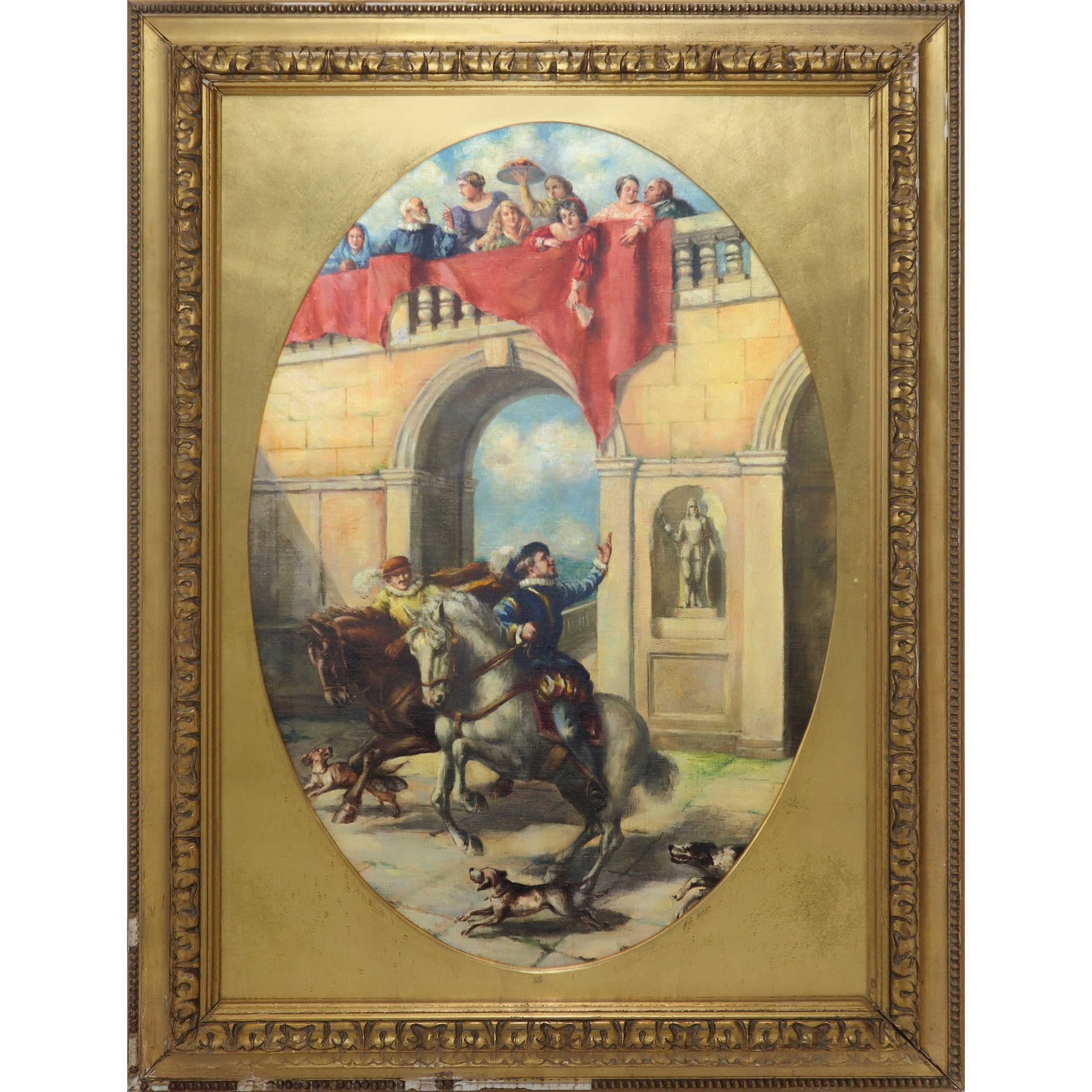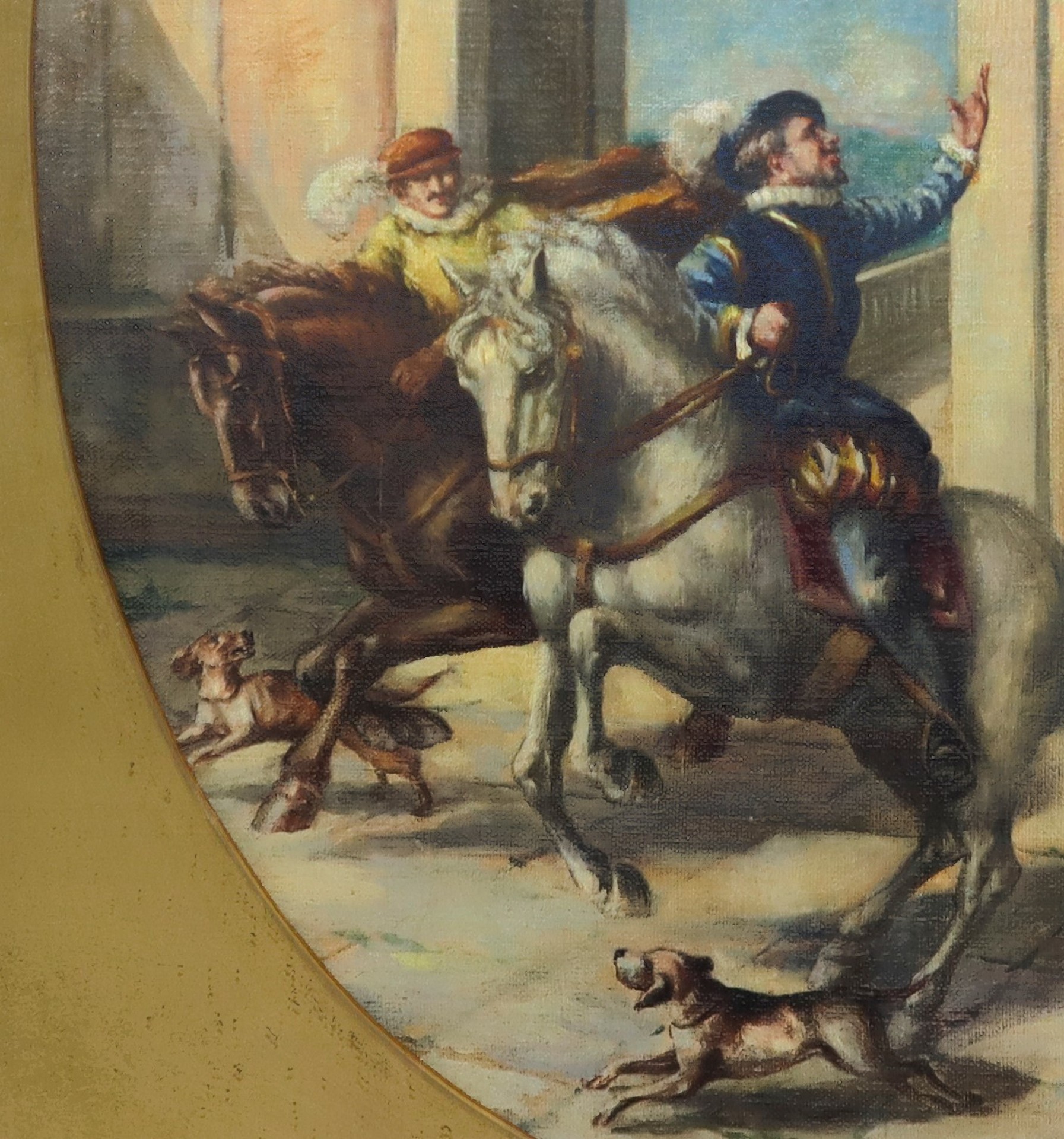 Cavaliere e donne al balcone ovale cm 45 x 65, in cornice cm 85 x 65 olio su tela applicata tavoletta