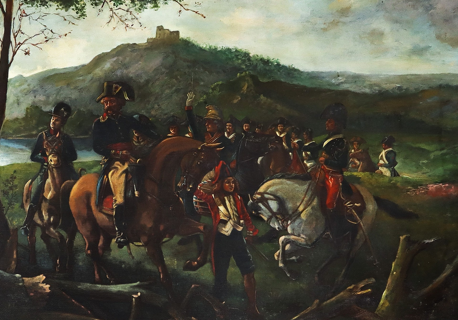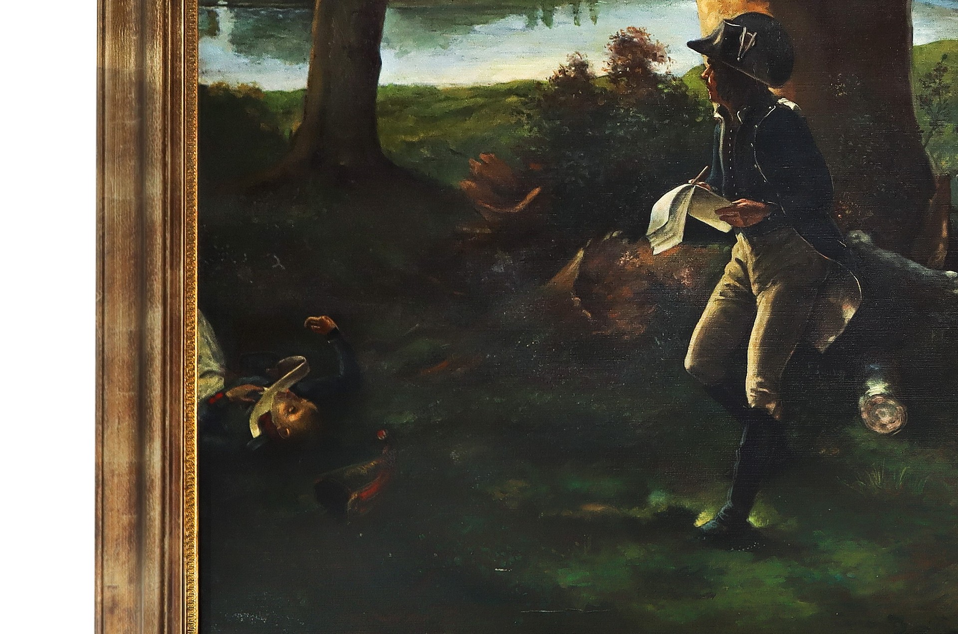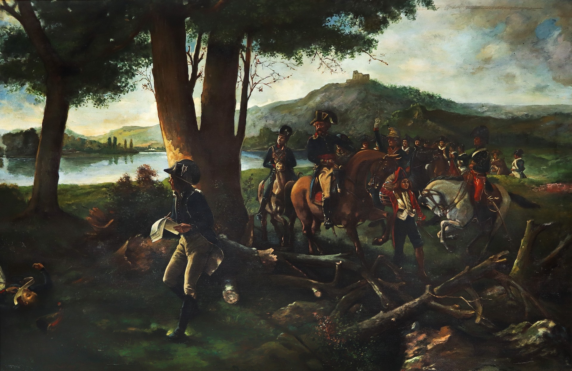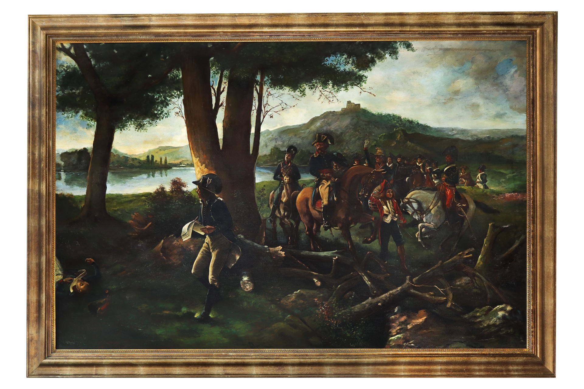 Soldati napoleonici, scena militare, nineteen Secolo Cm 130x193, in cornice cm 152x213 Dipinto ad olio su tela Firmato in basso a destra.
