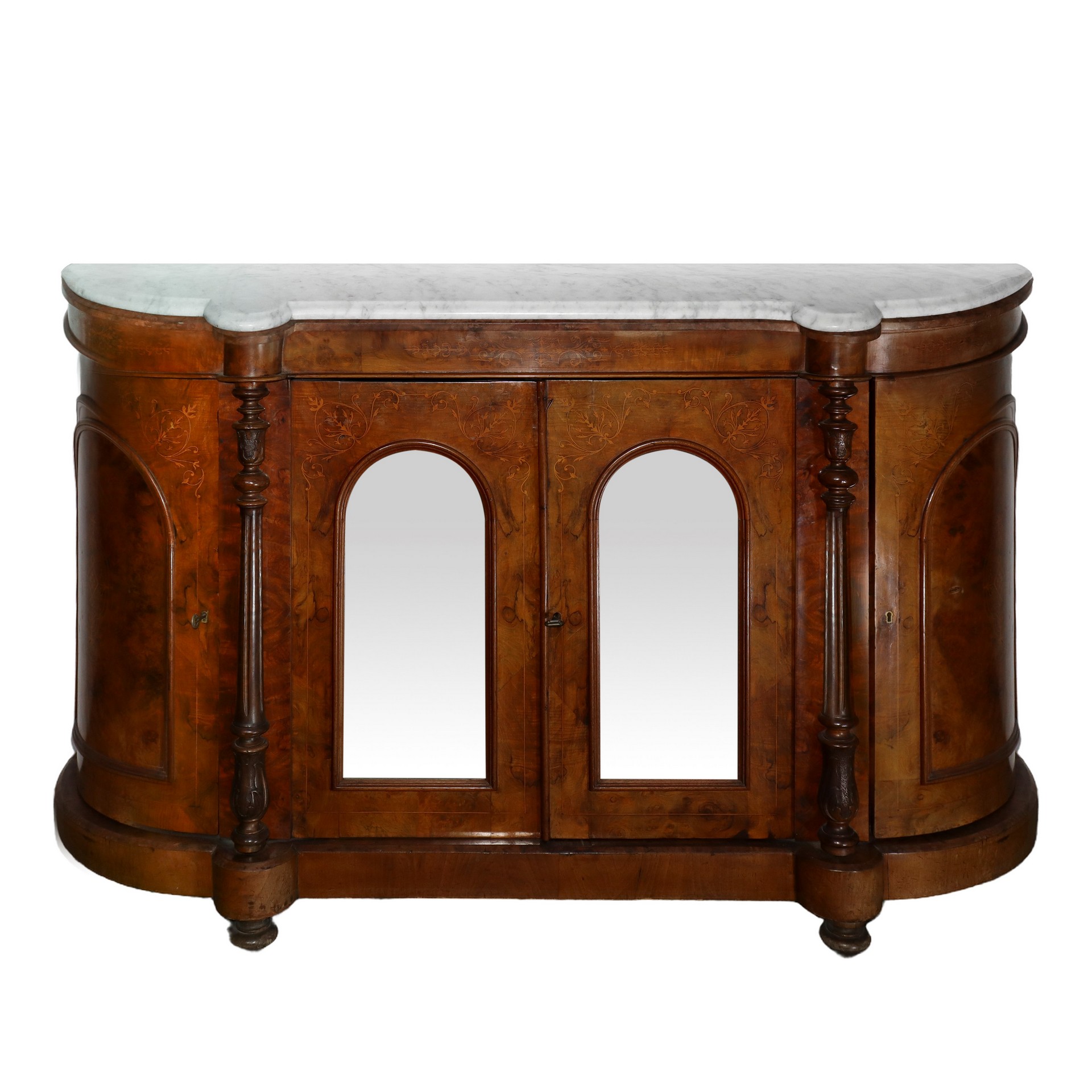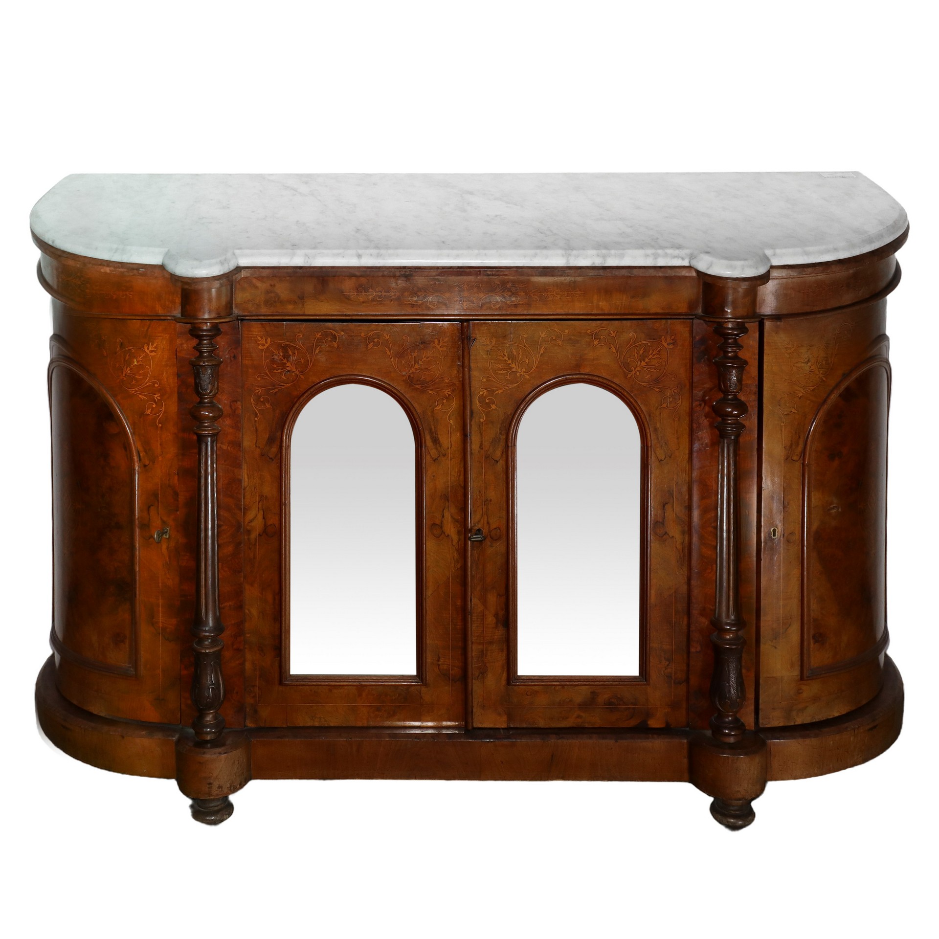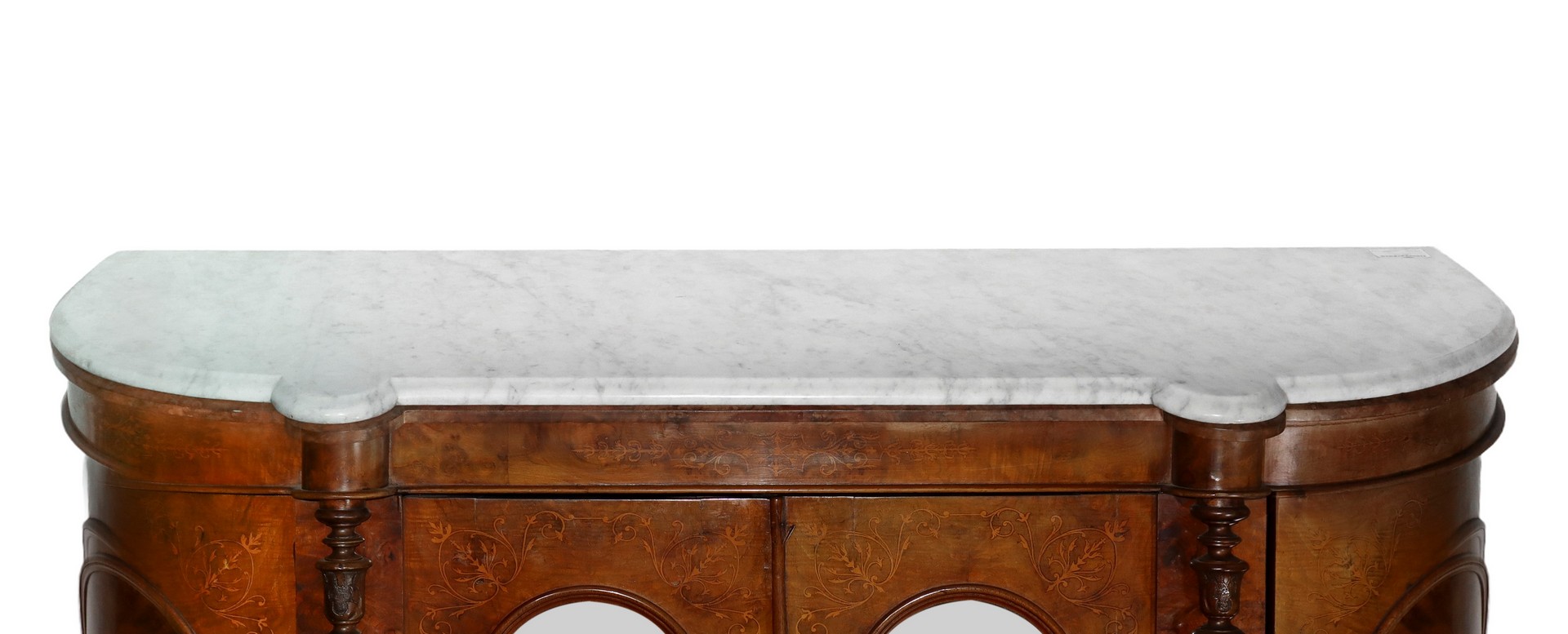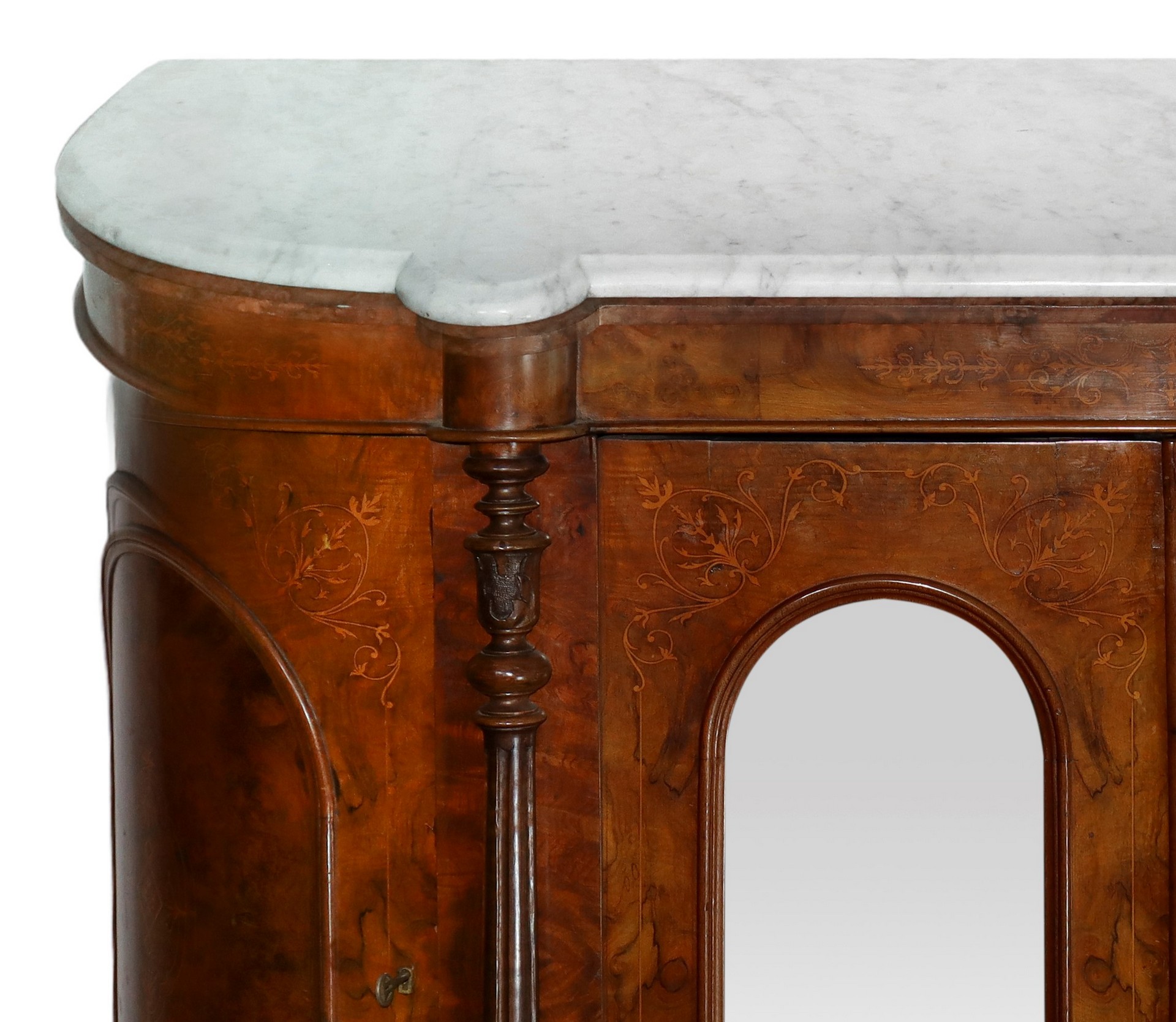 Mobile etagère in radica di noce, 19 Secolo H cm 96 x p cm 48,5 x L 155 con intarsi floreali in legni chiari sul fronte e sui lati. 2 sportelli centrali a specchio incentrati da due colonne laterali più 2 laterali. Piedi a cipolla schiacciata e marmo bianco al pianocon intarsi floreali in legni chiari sul fronte e sui lati. 2 sportelli centrali a specchio incentrati da due colonne laterali più 2 laterali. Piedi a cipolla schiacciata e marmo bianco al piano