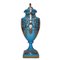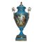 Vaso in porcellana a poutiche con manici , nello stile azzurro di Sevres, 20 Secolo H 48 base 13x13 Con fondo azzurro e decori in oro, dipinto fronte e retro con scene di genere. Marchio sulla baseCon fondo azzurro e decori in oro, dipinto fronte e retro con scene di genere. Marchio sulla base
