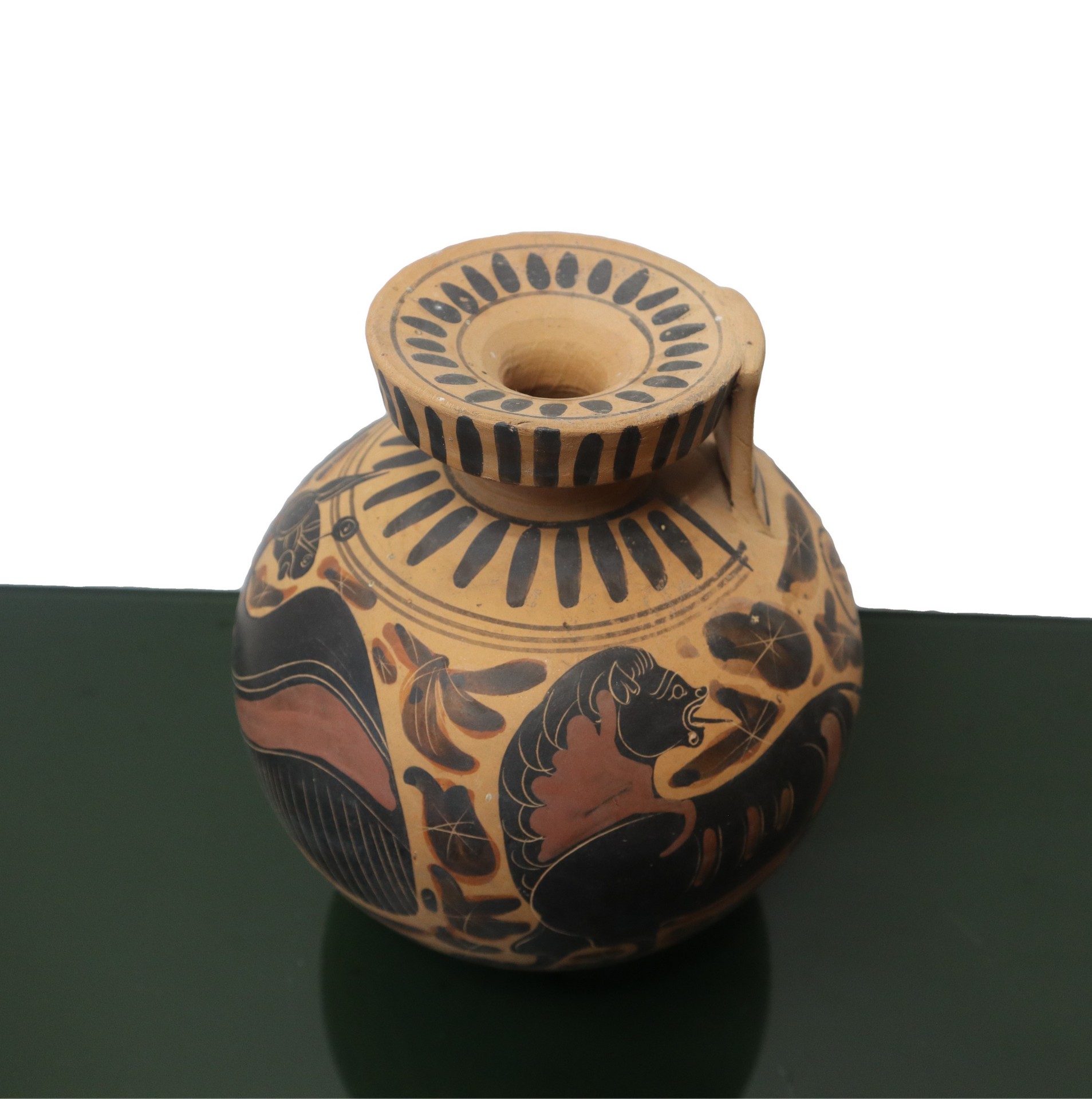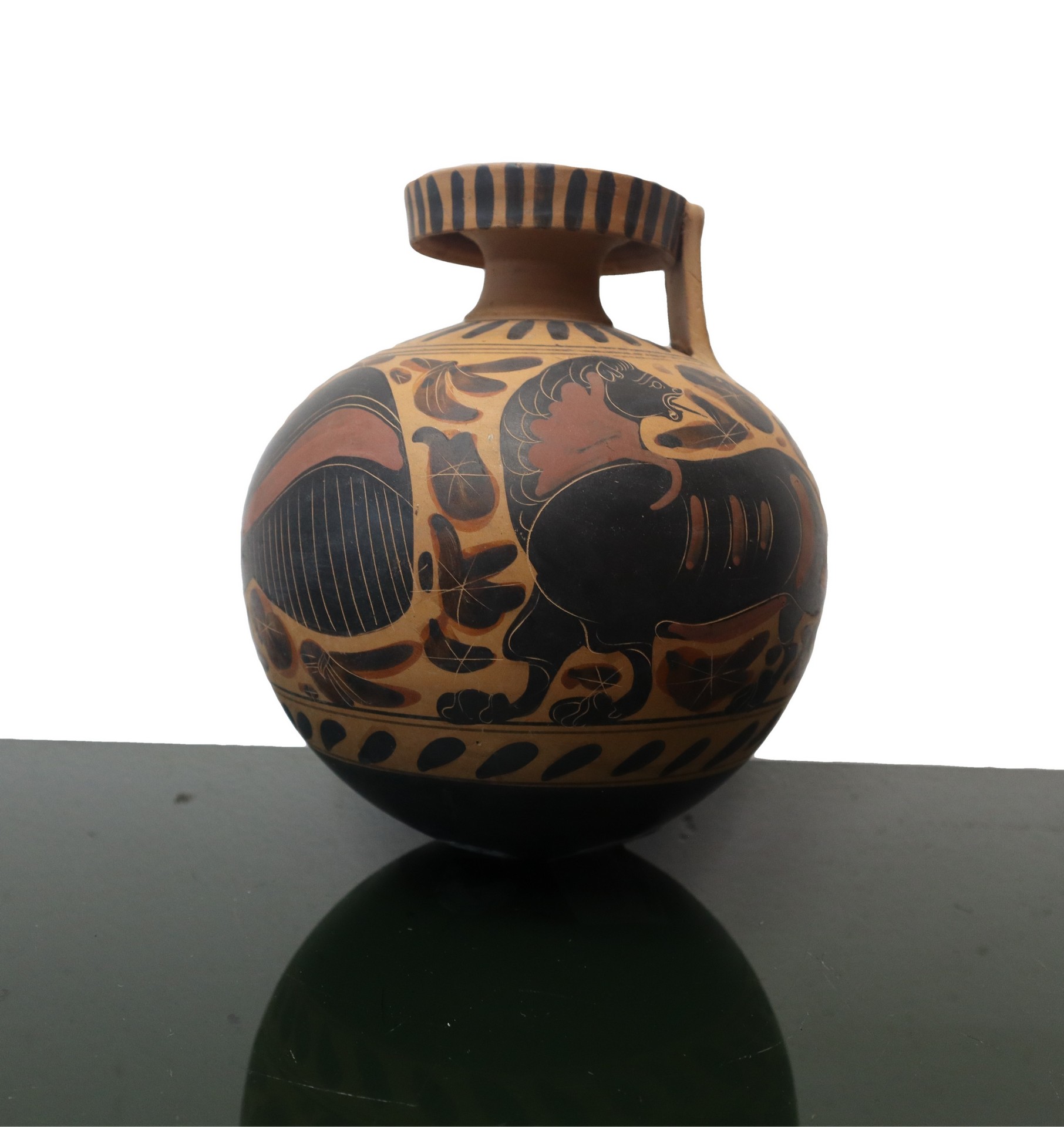 Riproduzione archeologica, Vaso globulare con manico collo stretto ed ampio collo piatto. Anza sull'orlo e sulla spalla. Raffigurazioni mitilogiche. Commerciabili giusto parere Soprintendenza per i beni culturali ed ambientali di Catania del 13/12/22 N° protocollo 19871