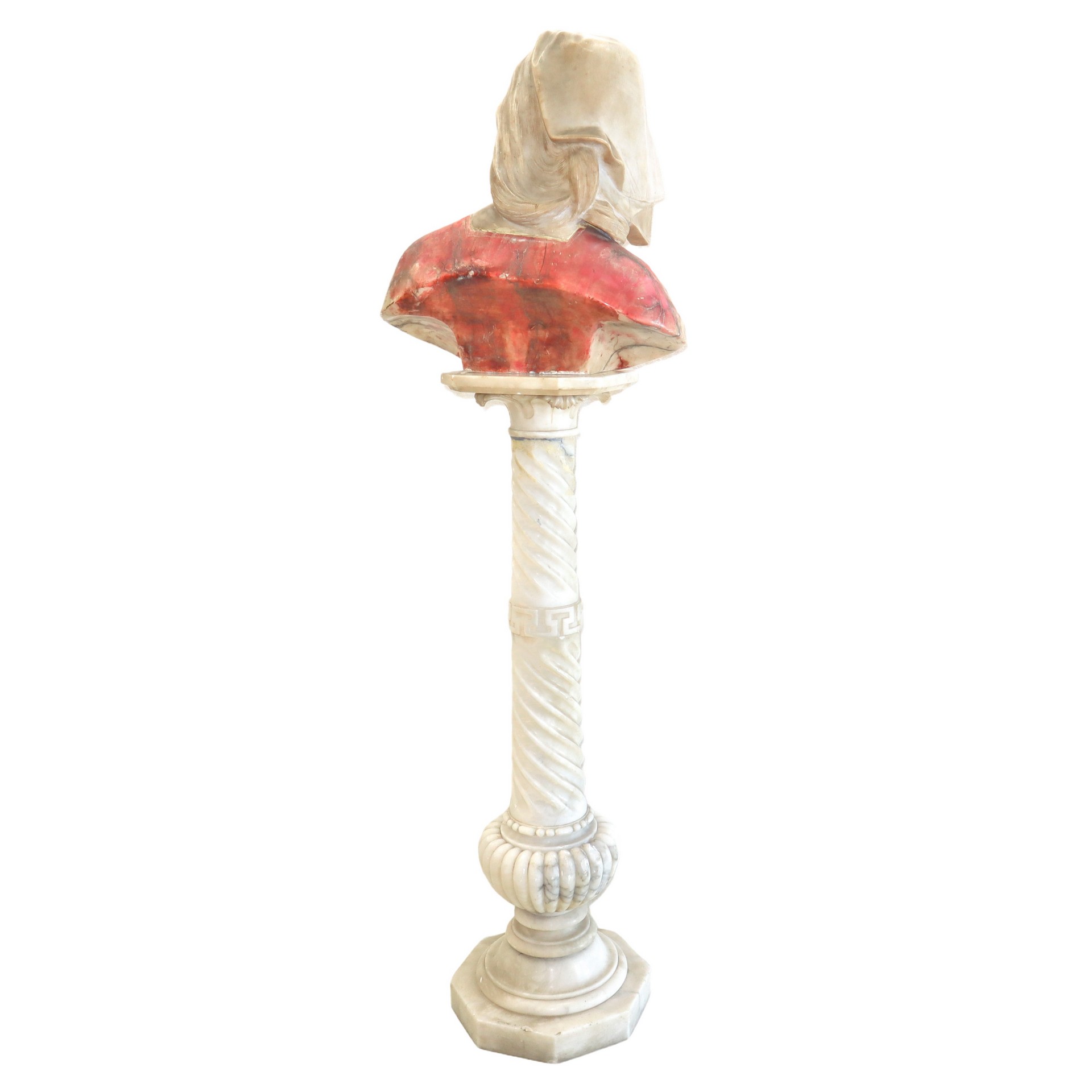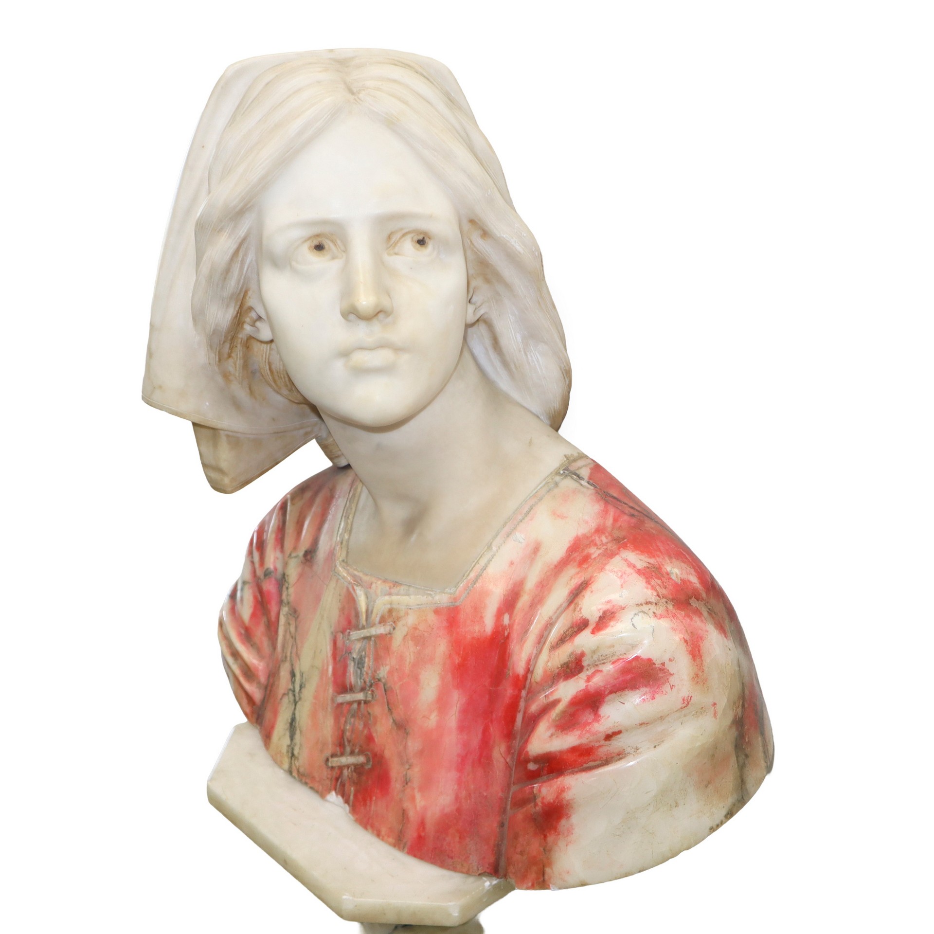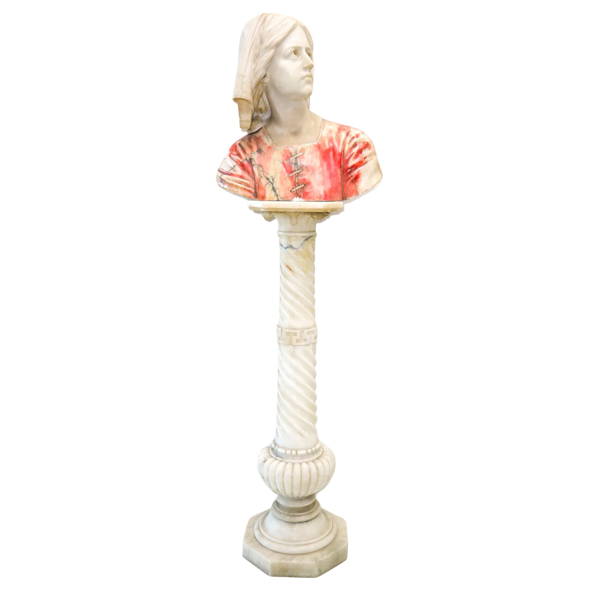 Giovanna D'arco, mezzobusto policromo in alabastro con supporto a colonna in alabastro, Nineteen century. Mezzo busto H cm 48x 46, colonna h cm 106 Colonna con base ottagonale e fusto a torcion. Presenti incollature sulla colonna Colonna con base ottagonale e fusto a torcion. Presenti incollature sulla colonna