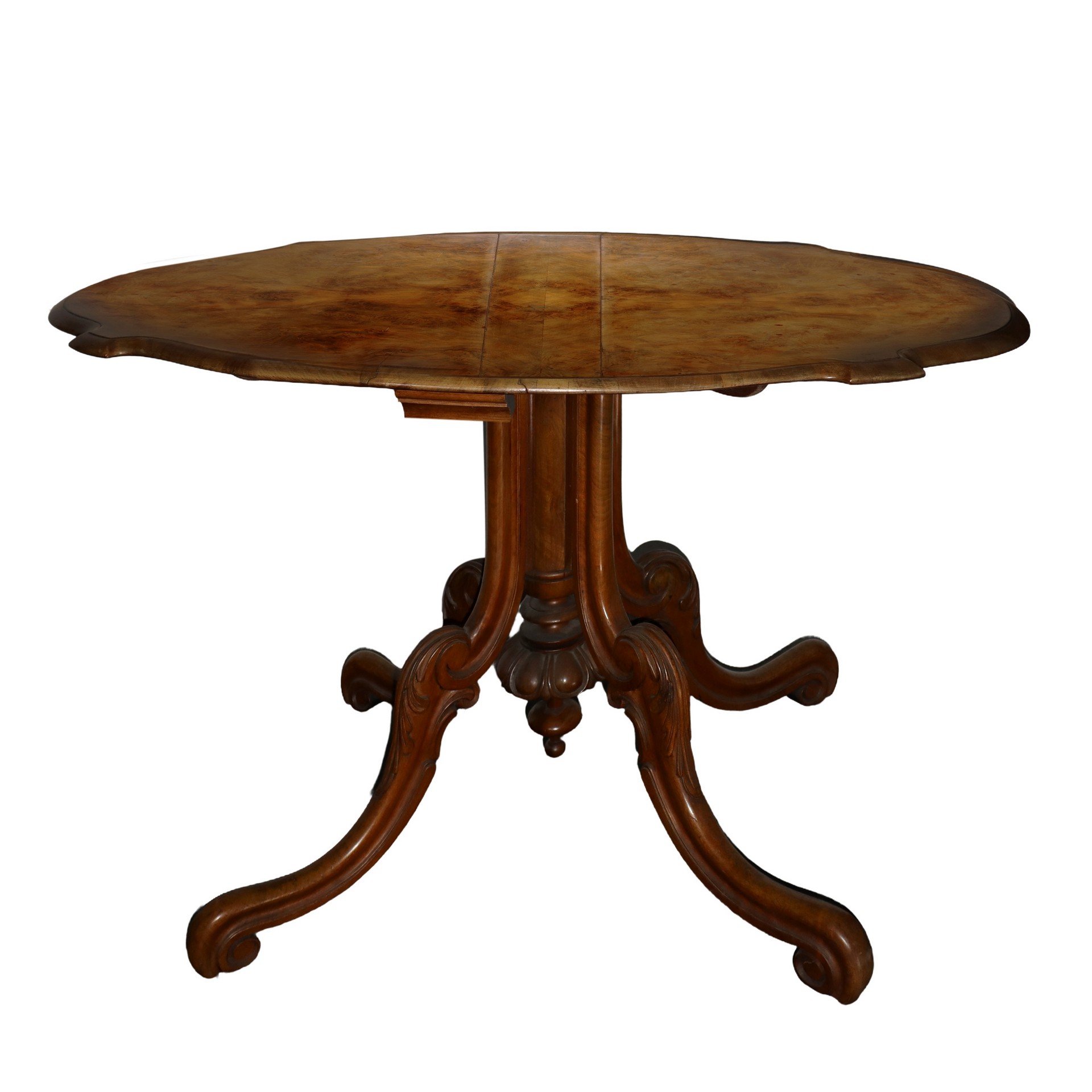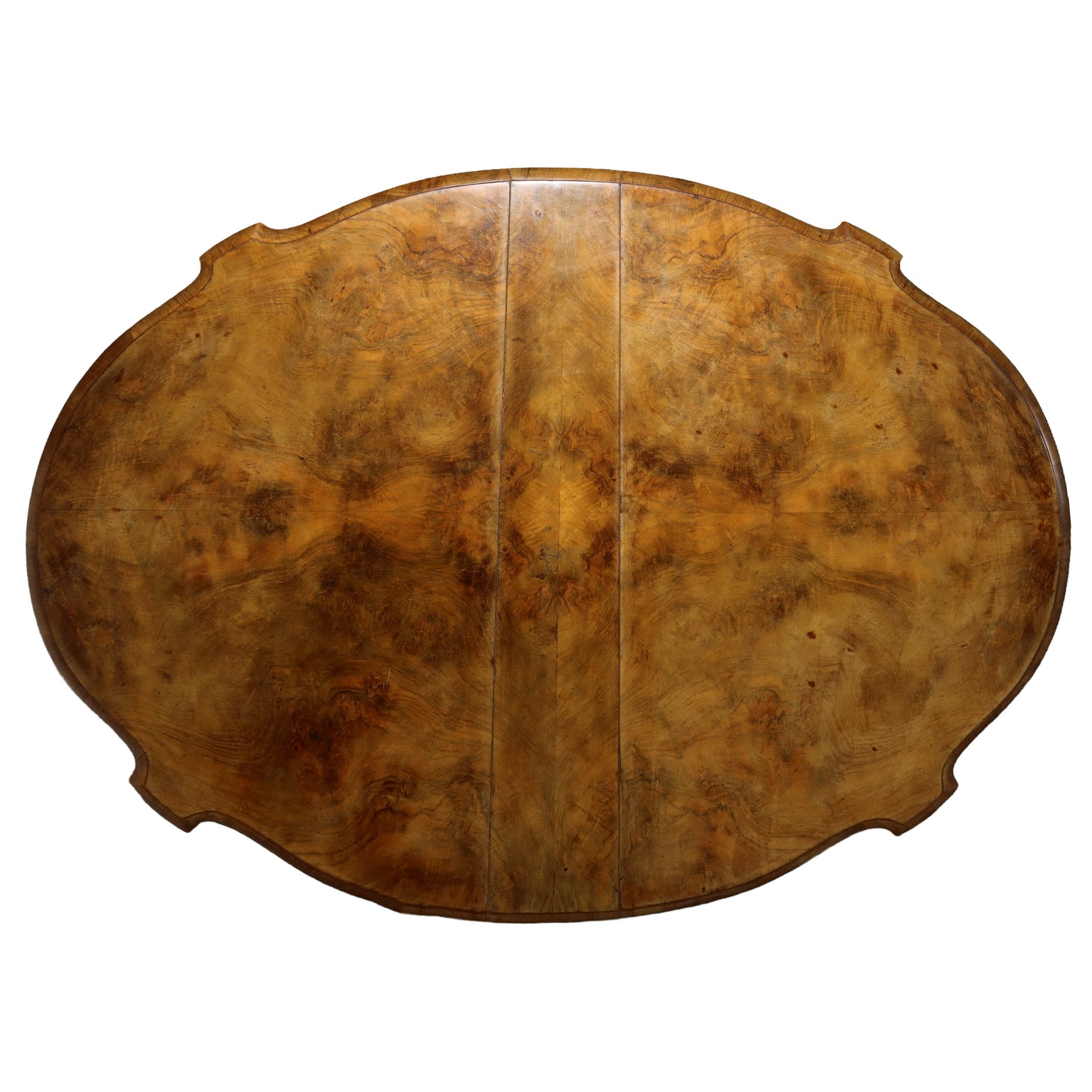 Tavolo in radica con piede a quattro razze più tre sedie, Early 20 Secolo H 71 x 114 x 92 Piano ovale smerlatoPiano ovale smerlato