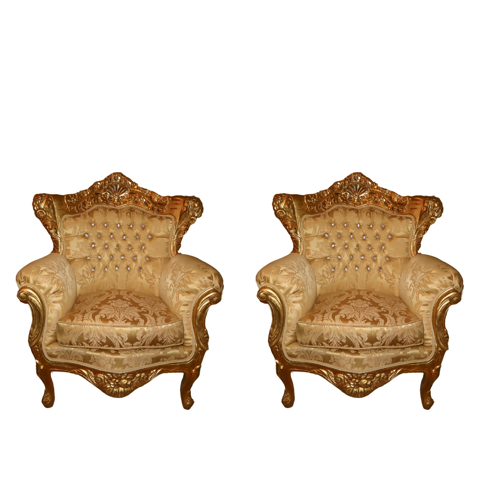 Coppia di poltrone in stile barocco in legno dorato, 20 Secolo H cm 118 L cm 92 Tapezzeria damascata con spalliera capitonnè e bottoni in cristallo, stile Luigi XIV,Tapezzeria damascata con spalliera capitonnè e bottoni in cristallo, stile Luigi XIV,
