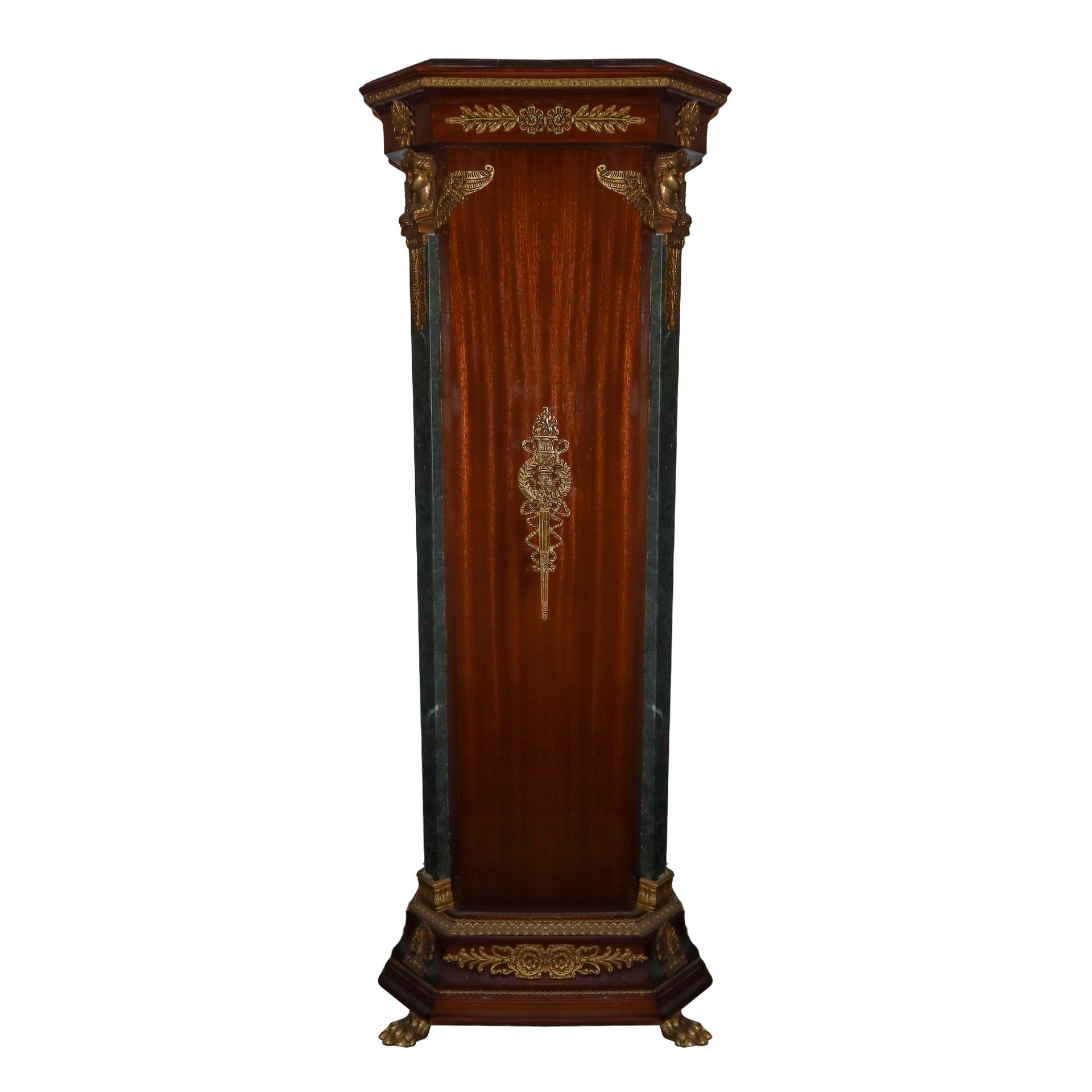 Coppia di gueridon in legno di mogano stile Impero, 20 Secolo H cm 130 ,piano 52 x 52 , base 45 x 45 Marmo verde alpi al piano e ai lati a forma di lesene, con bronzi applicati ai quattro angoli, a forma di vittorie alate, piedi dorati leonini, festoni in bronzo applicatiMarmo verde alpi al piano e ai lati a forma di lesene, con bronzi applicati ai quattro angoli, a forma di vittorie alate, piedi dorati leonini, festoni in bronzo applicati