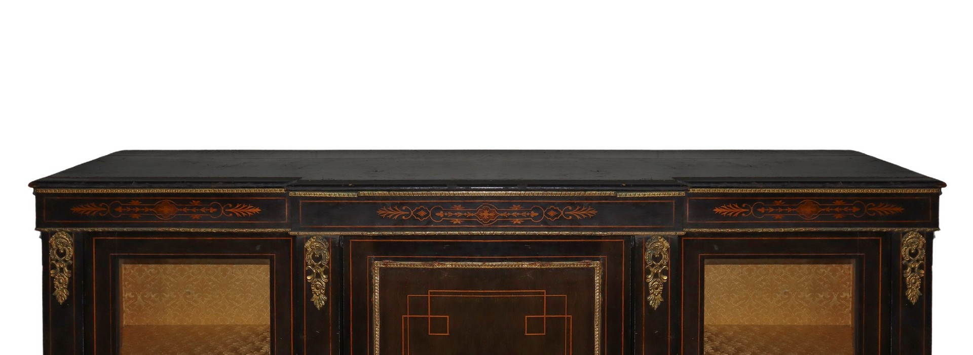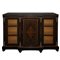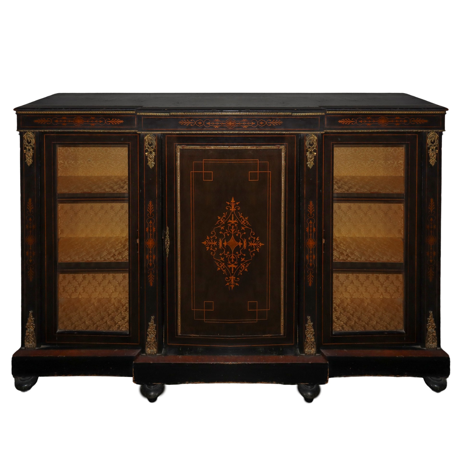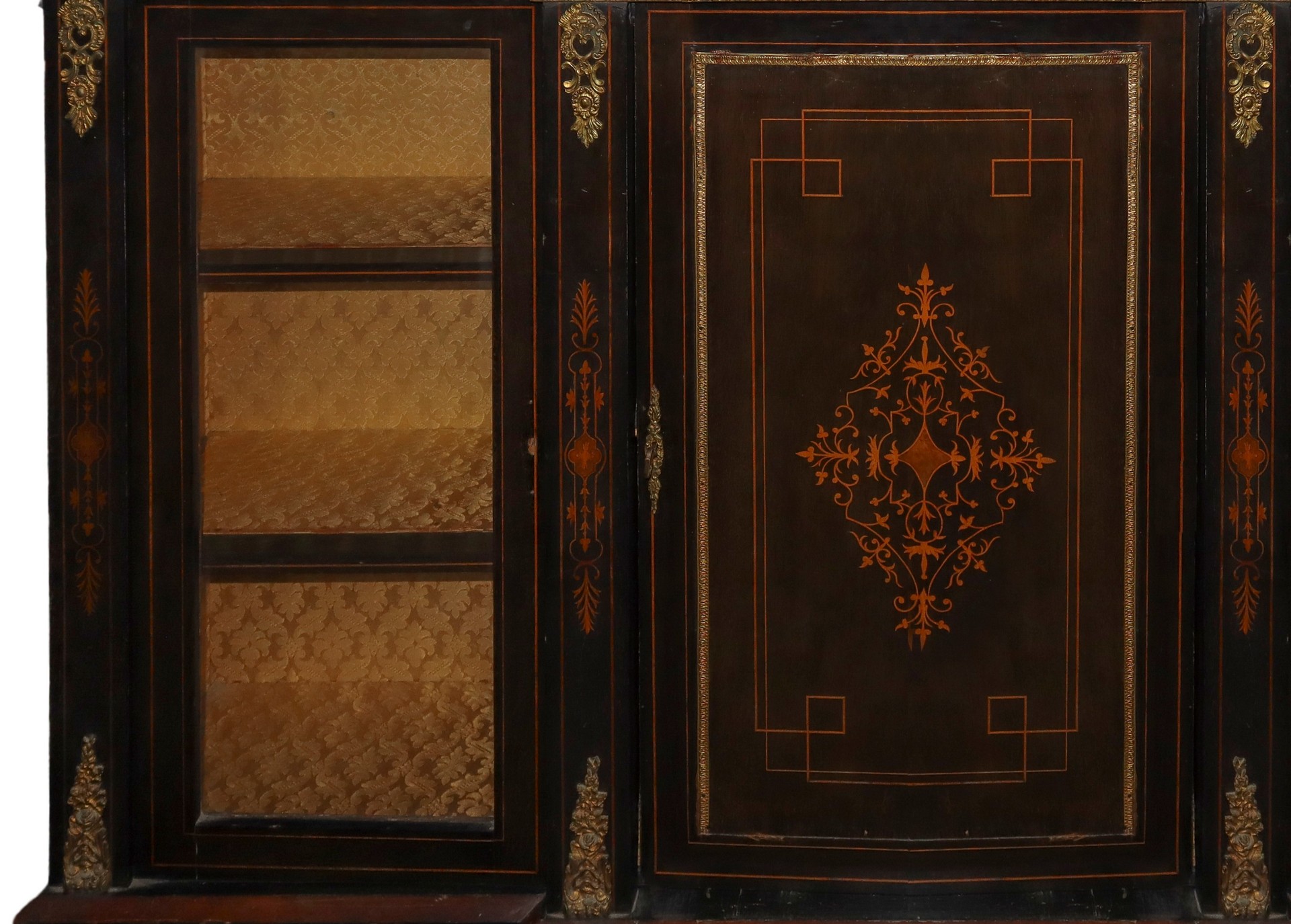 Etagère Napoleone III in legno nero ebanizzato, 19 Secolo H cm 107 x 151 x 34 Sportello centrale con intarsi più due sportelli laterali in vetro , applicazioni in metallo dorato ai piantoni e alle cornici.Sportello centrale con intarsi più due sportelli laterali in vetro , applicazioni in metallo dorato ai piantoni e alle cornici.