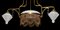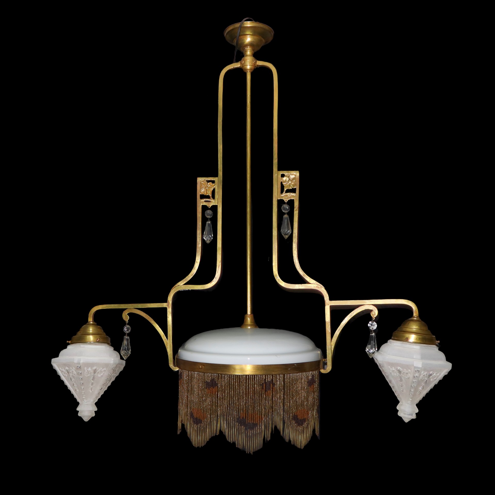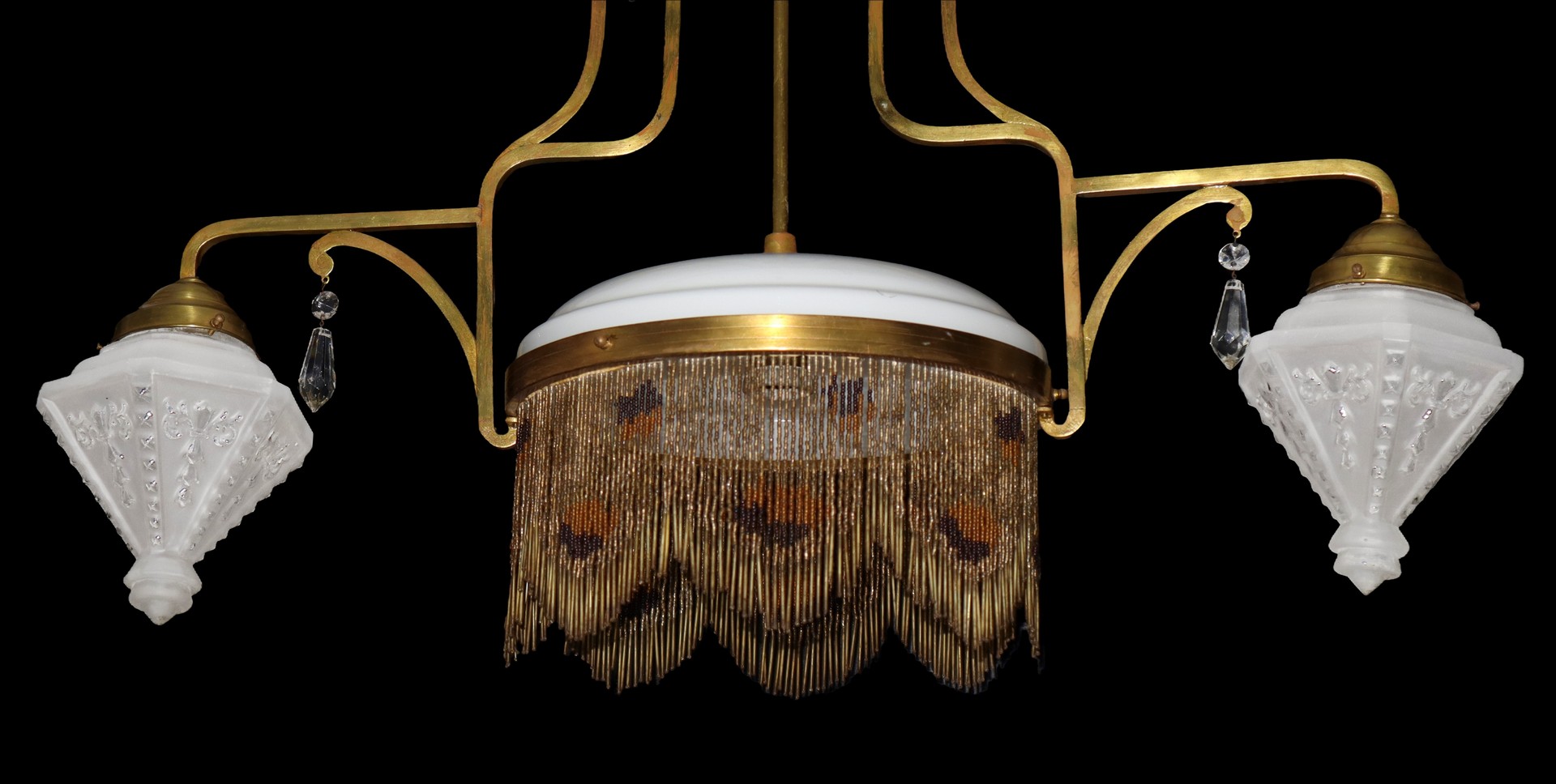 Lampadario del periodo Liberty., Early 20 Secolo H cm 88x84 Struttura in metallo dorato, a tre luci. Coppia di vetri a pigna laterali con centrale in opaline con frangia di cannule. ElettrificatoStruttura in metallo dorato, a tre luci. Coppia di vetri a pigna laterali con centrale in opaline con frangia di cannule. Elettrificato