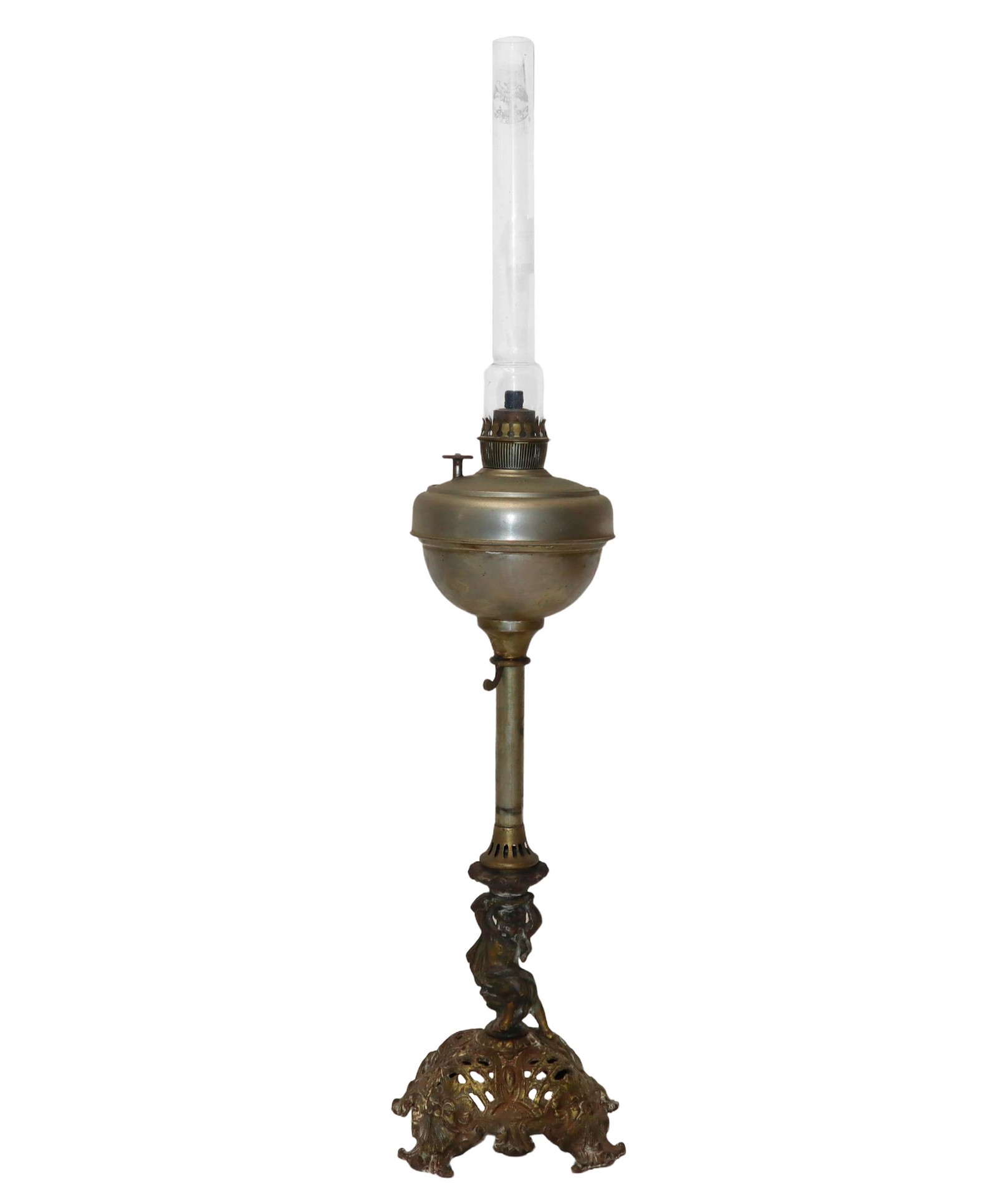 Lume a petrolio in ottone dorato con putto , nineteen Secolo H cm 64 Diffusore in vetroDiffusore in vetro