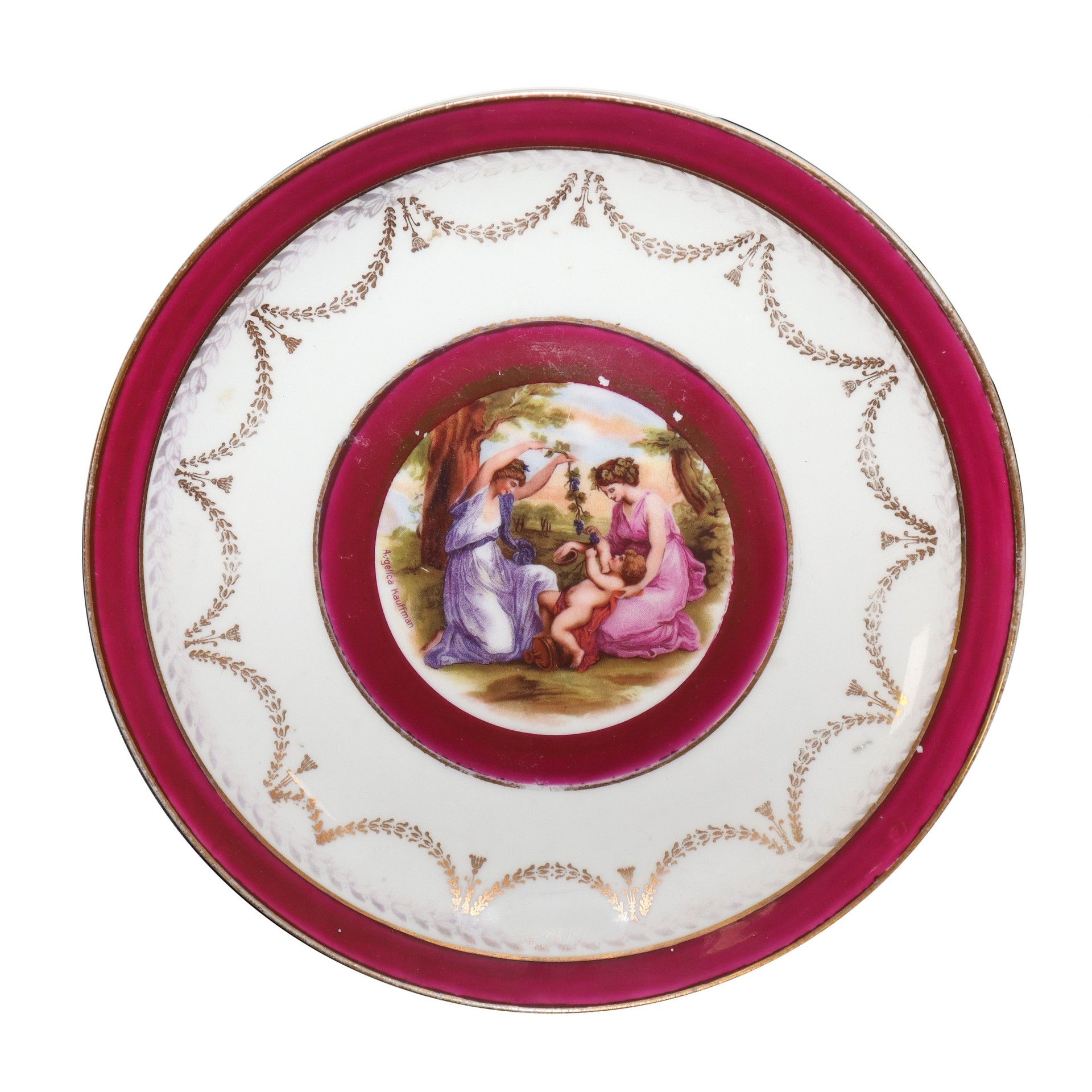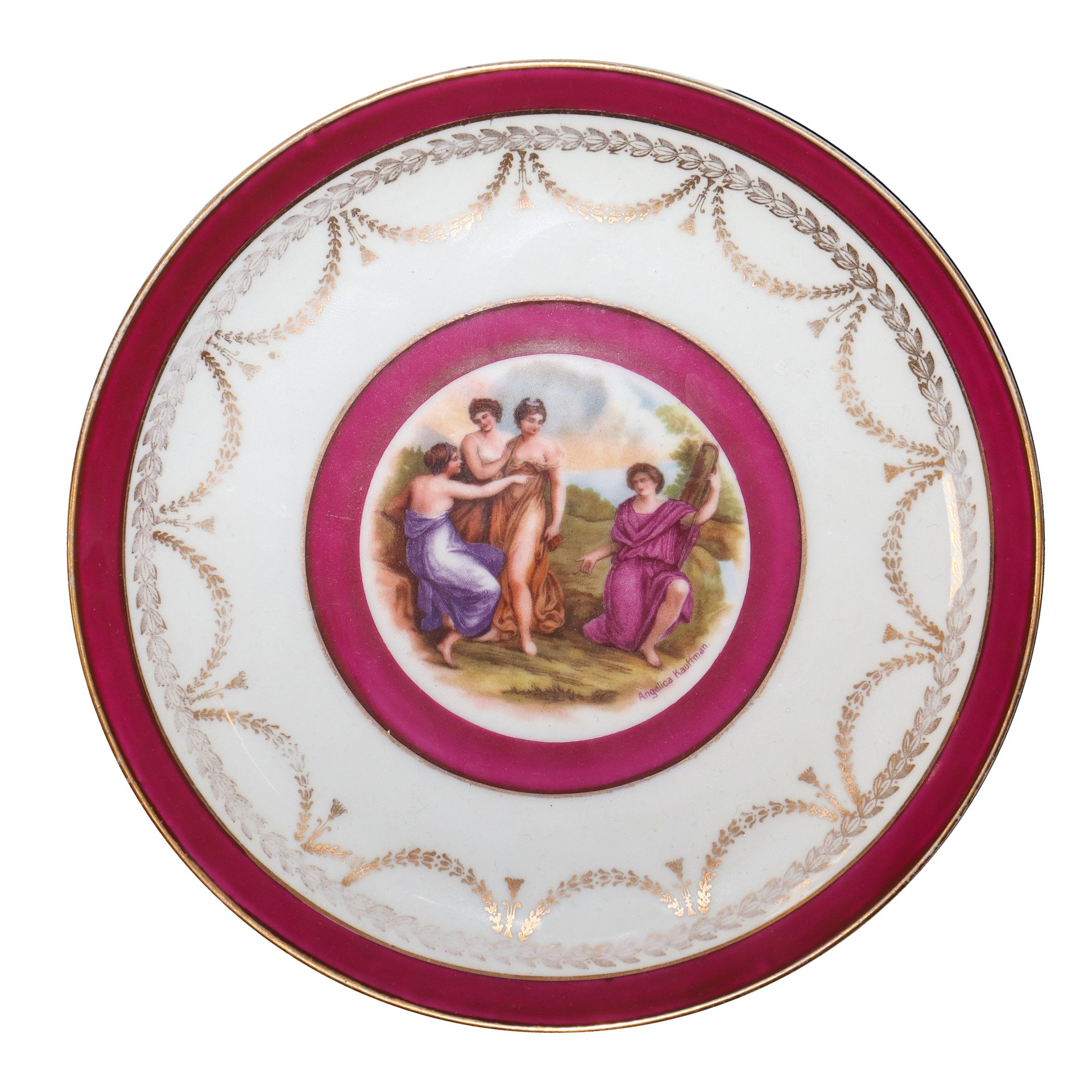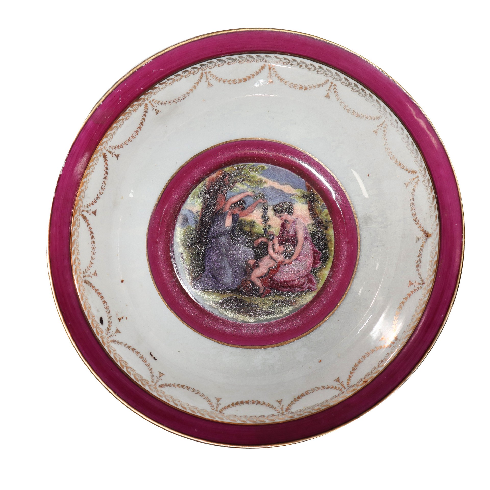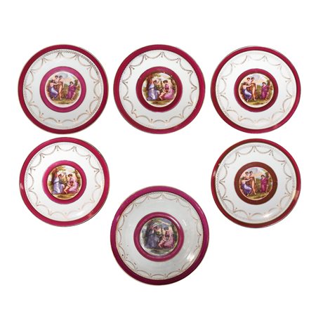 N.5 Piatti decorati a mano ed una ciotola con scene mitologiche e ghirlande dorate.