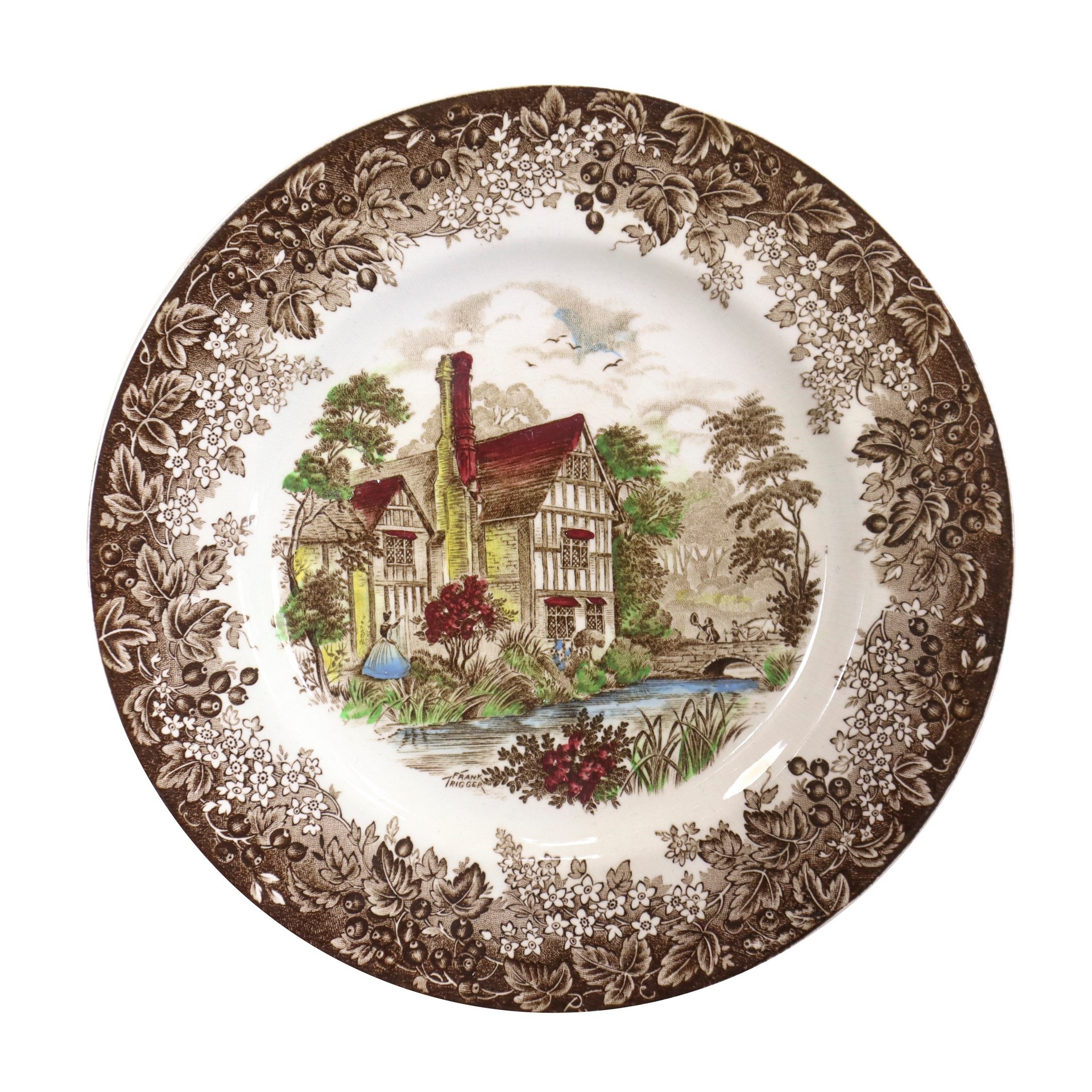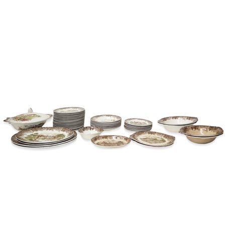 J & G Meakin England (1851-2000) - Servizio piatti policromi dis. Romantic England, Nineteen Secolo Formato da 22 piatti piani, 9 fondi, N.8 piattini da frutta, N.2 piatti da portata ovali cm 35, N.2 piatti da portata ovali cm 30, N.1 salsiera ovale cm 22, N.1 salsiera rotonda cm 15, N.2 piatti piani con manici cm 26, N.2 piatti insalatiere con manici cm 28, N.2 Piatti insalatiere con manici cm 24, N.1 zuppiera. Piccoli difetti.Formato da 22 piatti piani, 9 fondi, N.8 piattini da frutta, N.2 piatti da portata ovali cm 35, N.2 piatti da portata ovali cm 30, N.1 salsiera ovale cm 22, N.1 salsiera rotonda cm 15, N.2 piatti piani con manici cm 26, N.2 piatti insalatiere con manici cm 28, N.2 Piatti insalatiere con manici cm 24, N.1 zuppiera. Piccoli difetti.