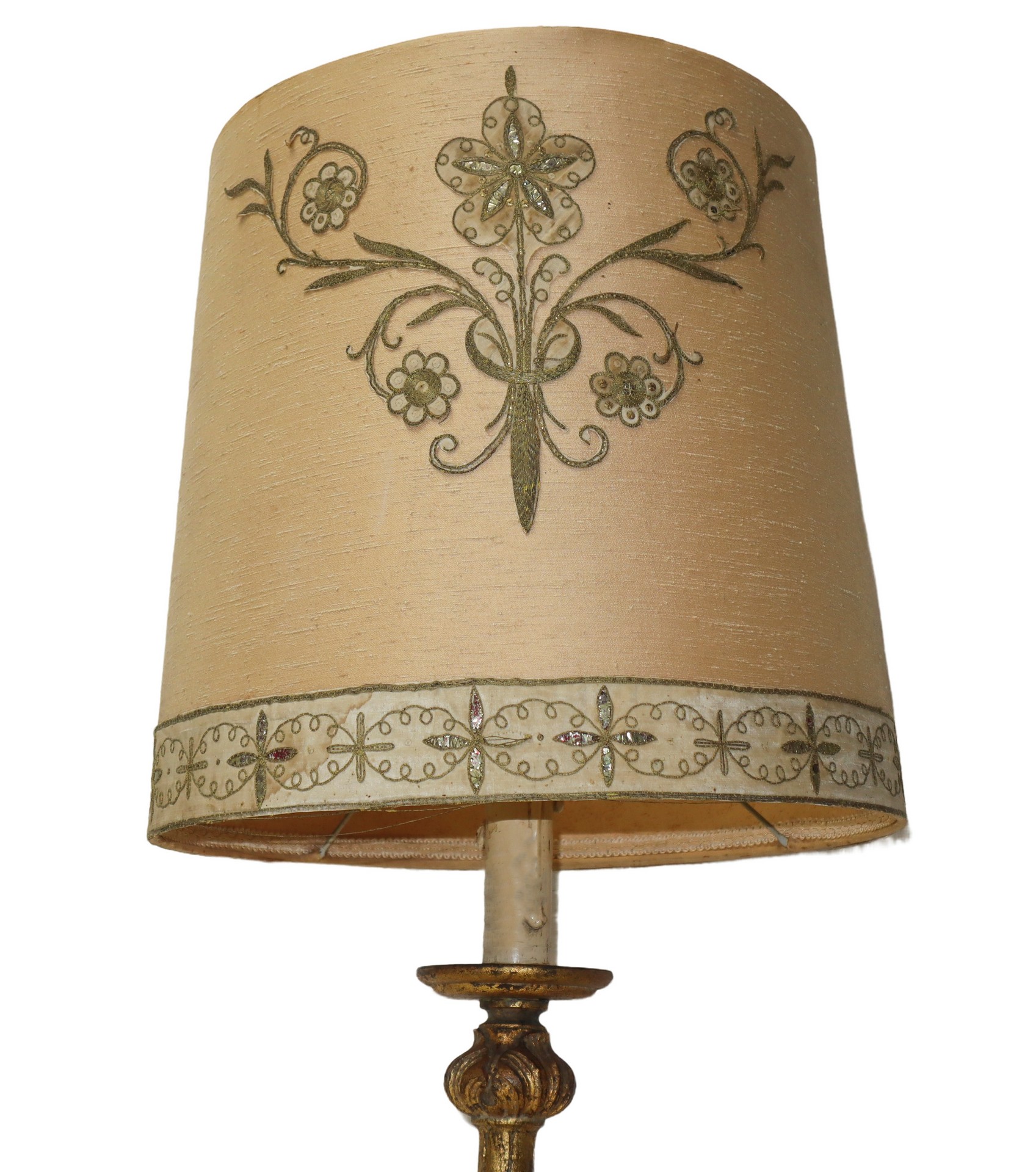 Candeliere in legno dorato, elettrificato ed adattato a lume, con paralume, nineteen century