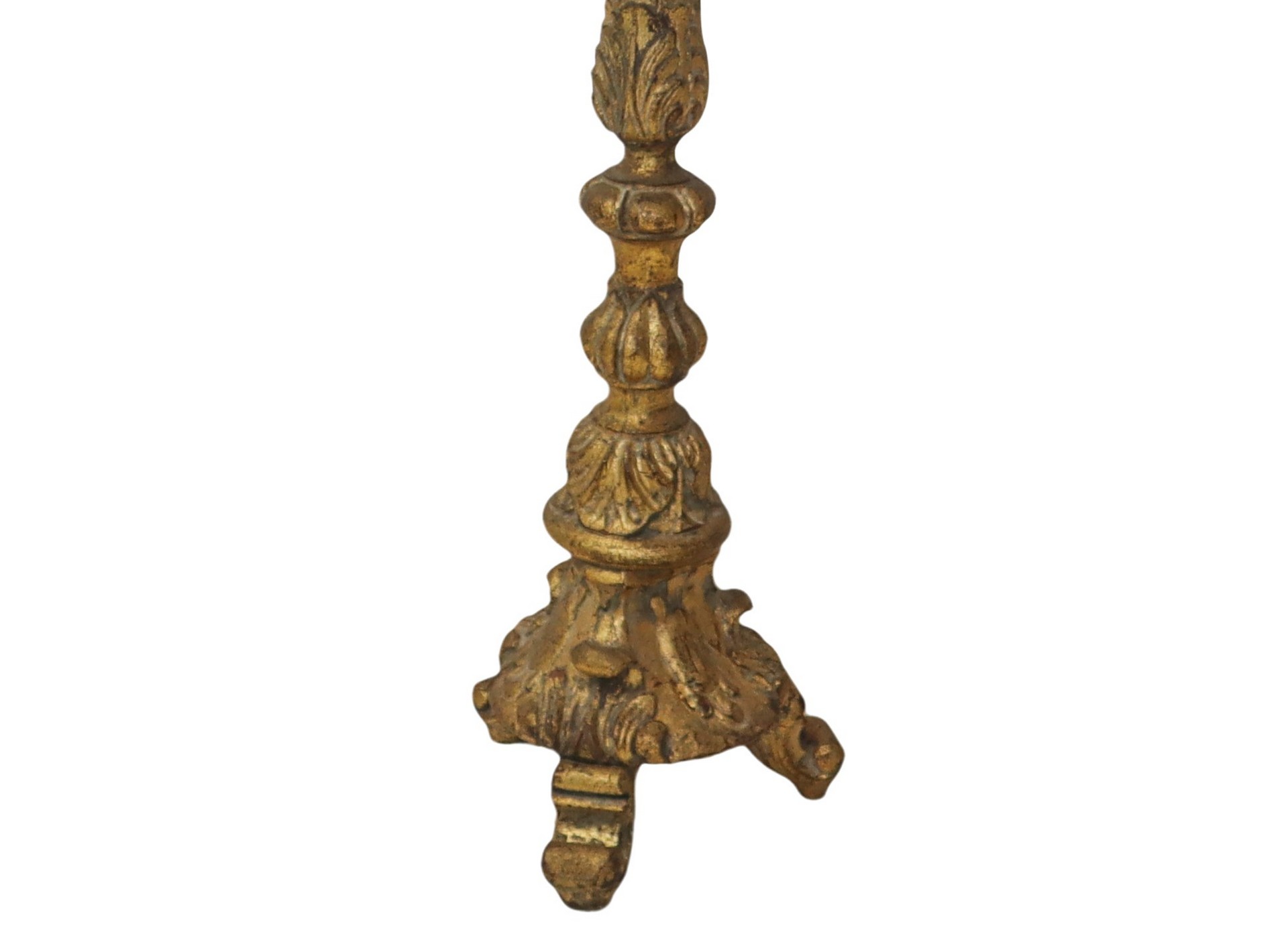 Candeliere in legno dorato, elettrificato ed adattato a lume, con paralume, nineteen Secolo H cm 61, con paralume H cm 107