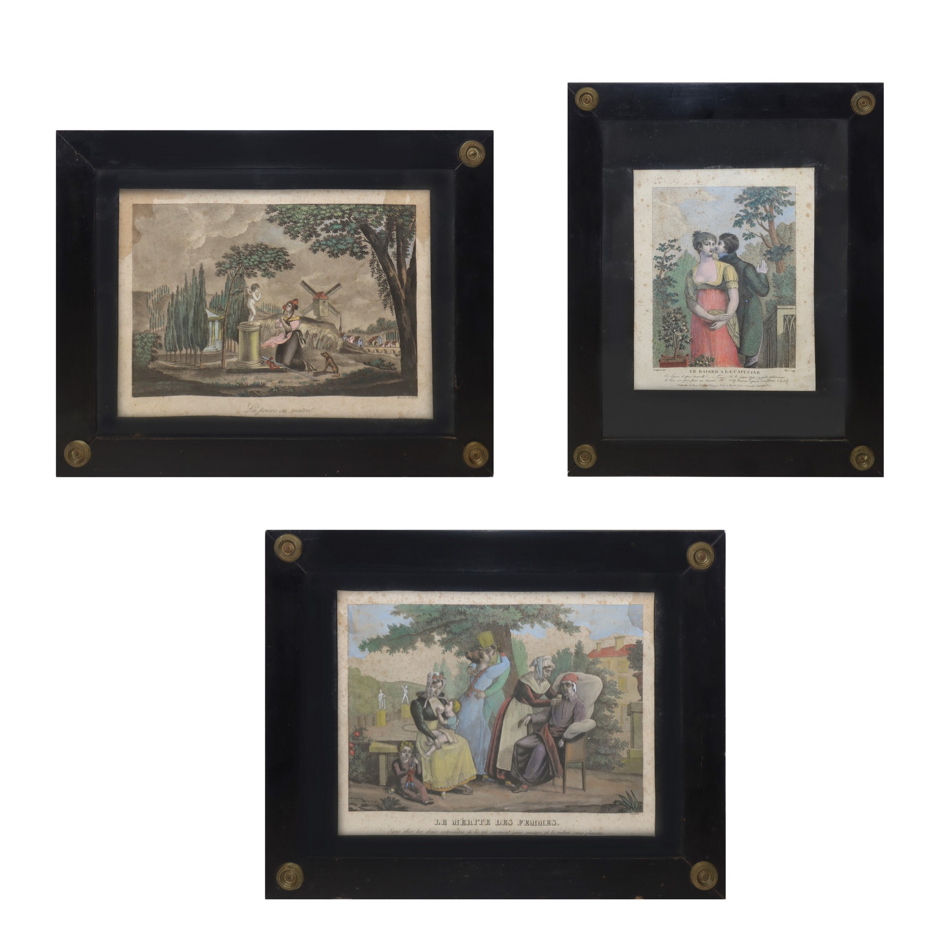 N.3 Incisioni acquerellate su carta vergata Le Mèrite des femmes H mm 217 x 285 / in cornice cm 33,5 x 42