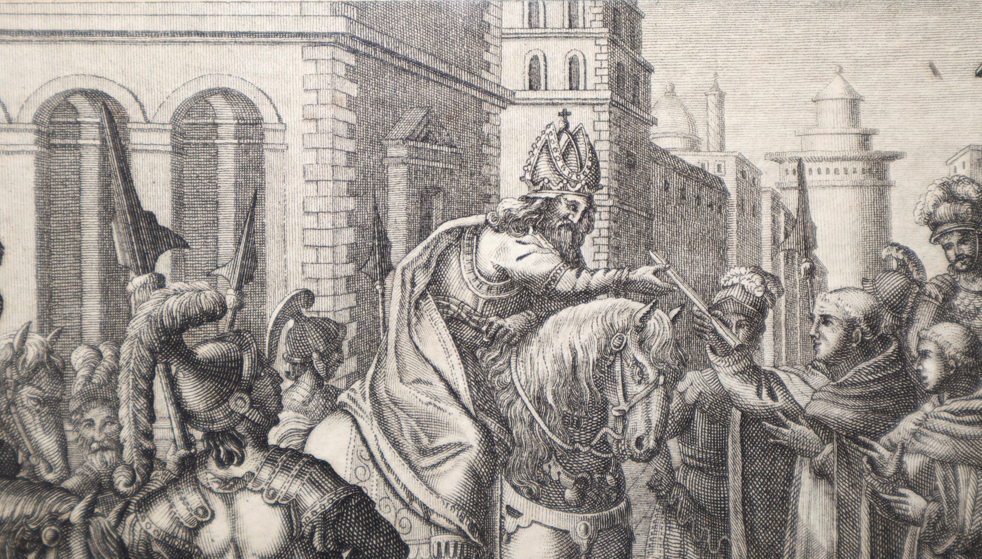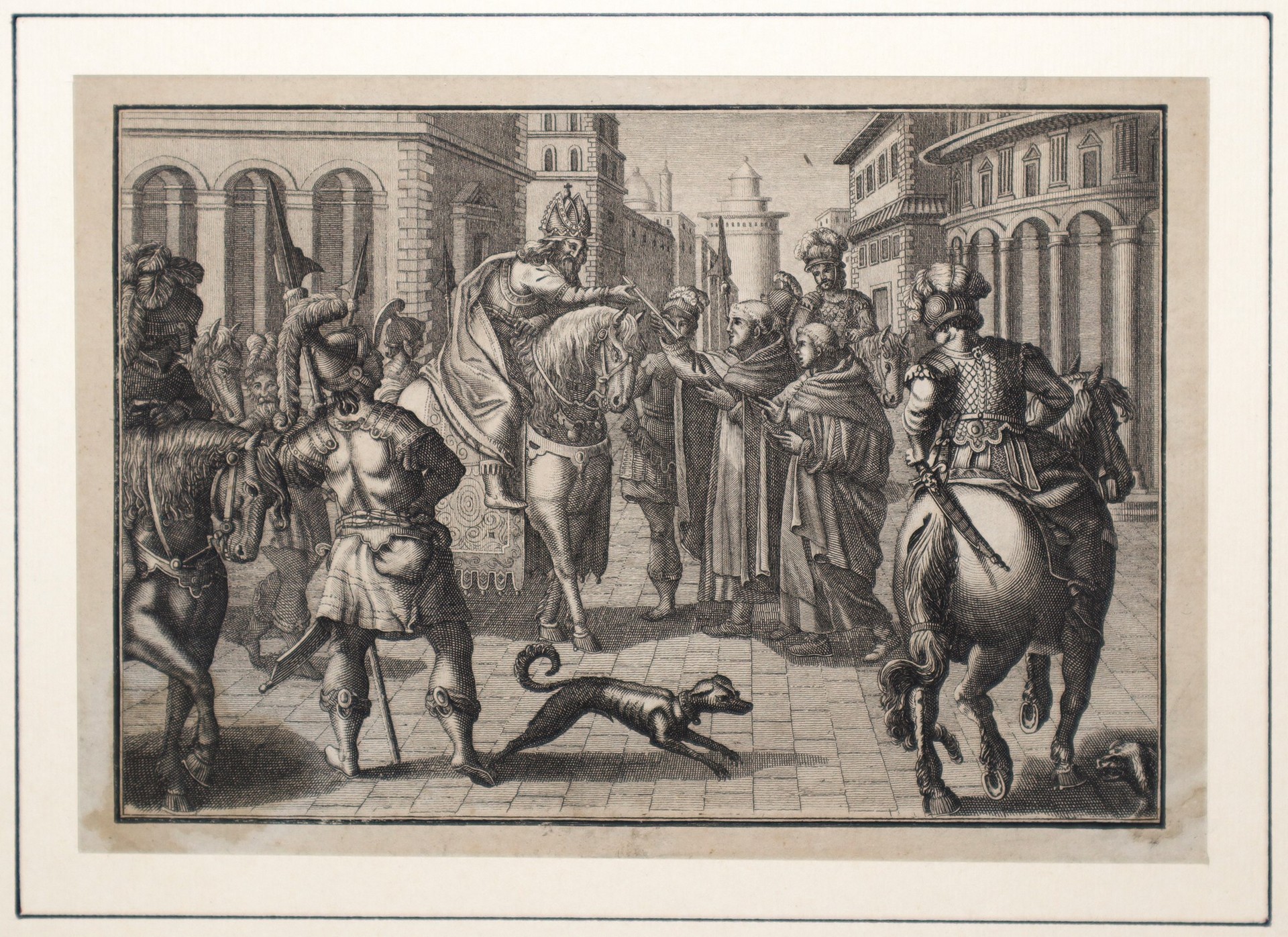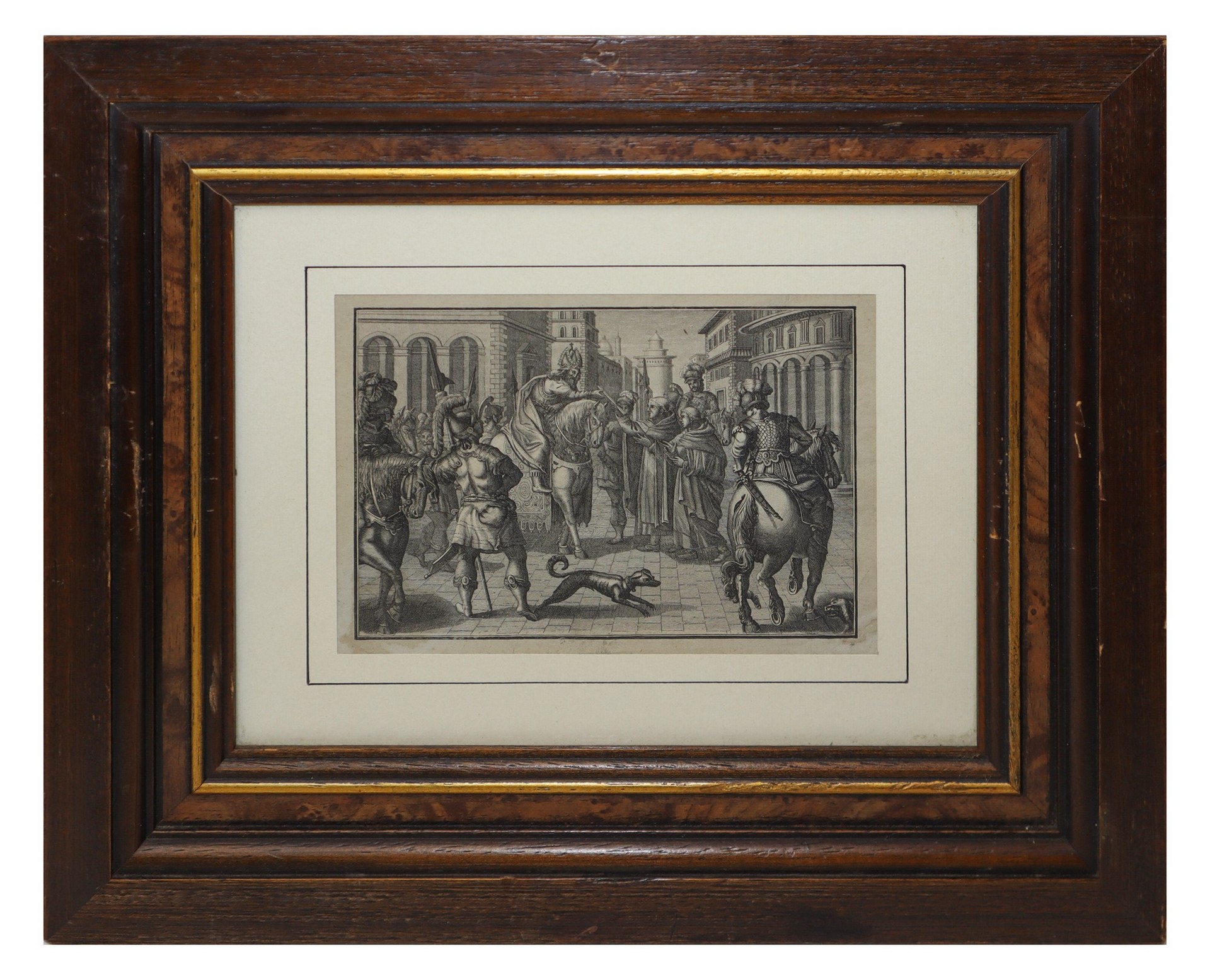 Scena con cavalieri, XVIII secolo cm 11 x cm 14, in cornice cm 27,5 x cm 32 Incisione ad acquaforte Raffigurante cavalli, cani e personaggi religiosi.