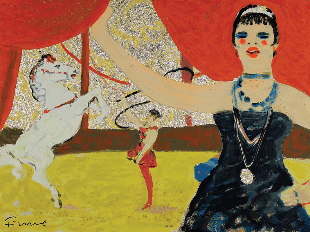 Fiume Salvatore Il Circo serigrafia a 35 colori su broccato applicato su masonite, cm. 60x80, es. 114/120 firmata in basso a sinistra, etichetta di Garanzia Edizioni Bora e timbro Fiume Controlled al retro, presenti tracce di umidità