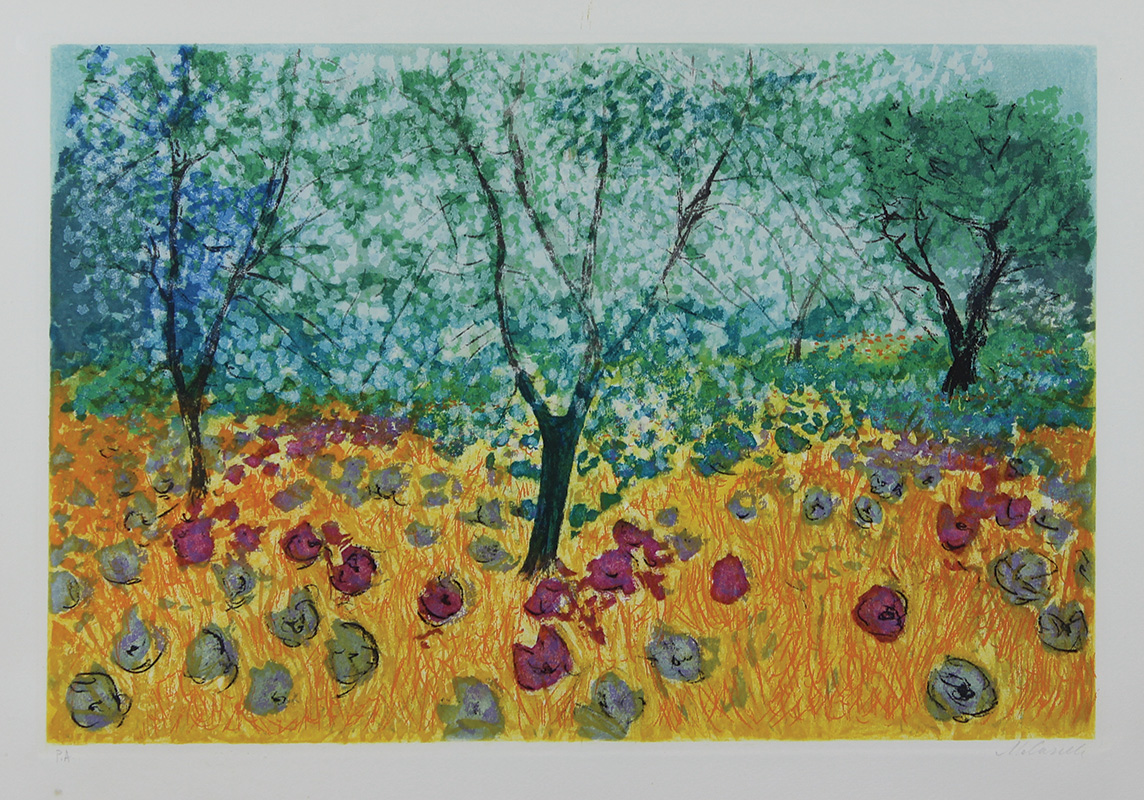 Cascella Michele La campagna a Rapino acquatinta a 18 colori su carta, cm. 60,5x78,5, es. prova d'autore firmata in basso a destra, certificato di autenticità della Edizioni Bora al retro