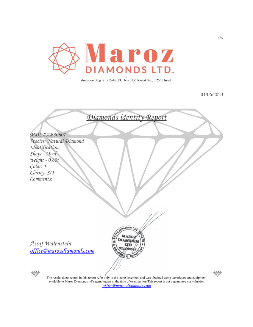 DIAMANTE 0,6 CT F - SI1 - TAGLIO OVALE - CERTIFICATO ID - AB30607
