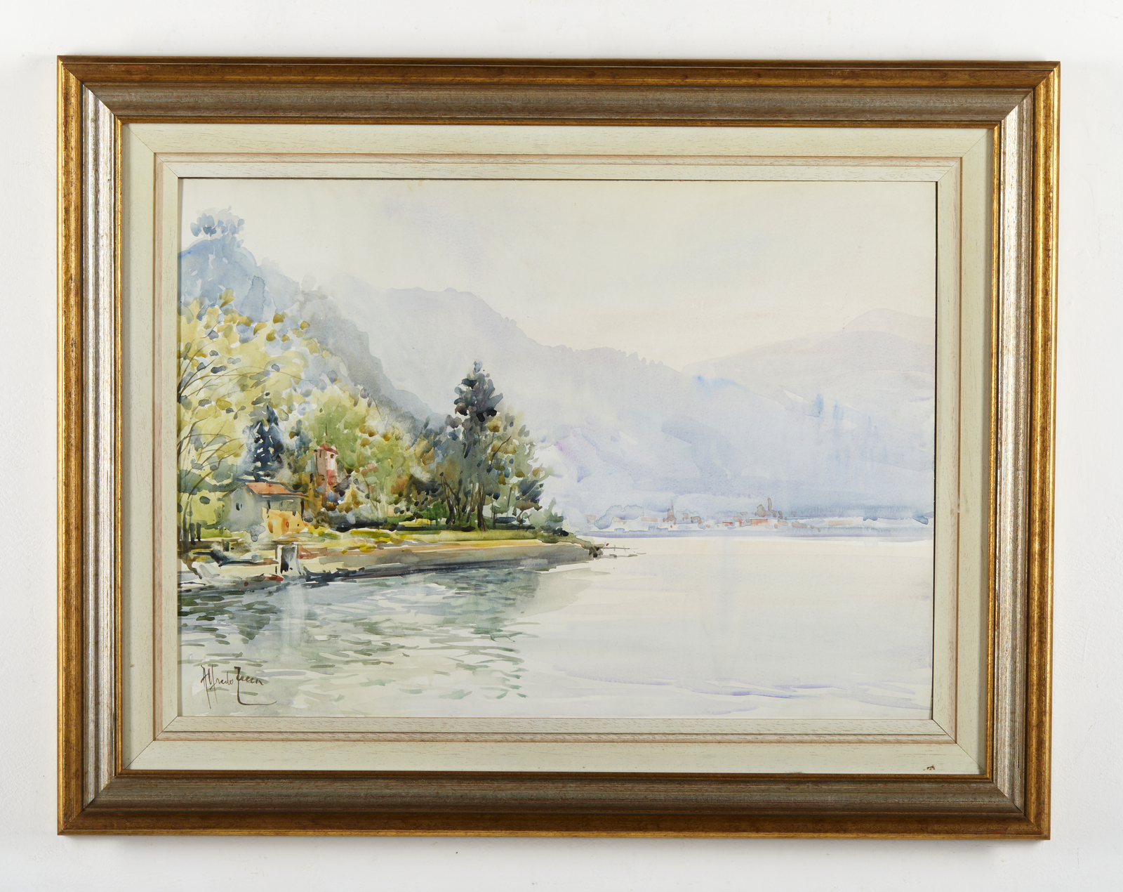 ZECCA ALFREDO (1917 - 1998) Lago di Lugano. Acquarello su carta applicata su cartoncino. Cm 69,00 x 50,00. Firma in basso a sinistra. Al retro titolo e firma. . Cornice presente